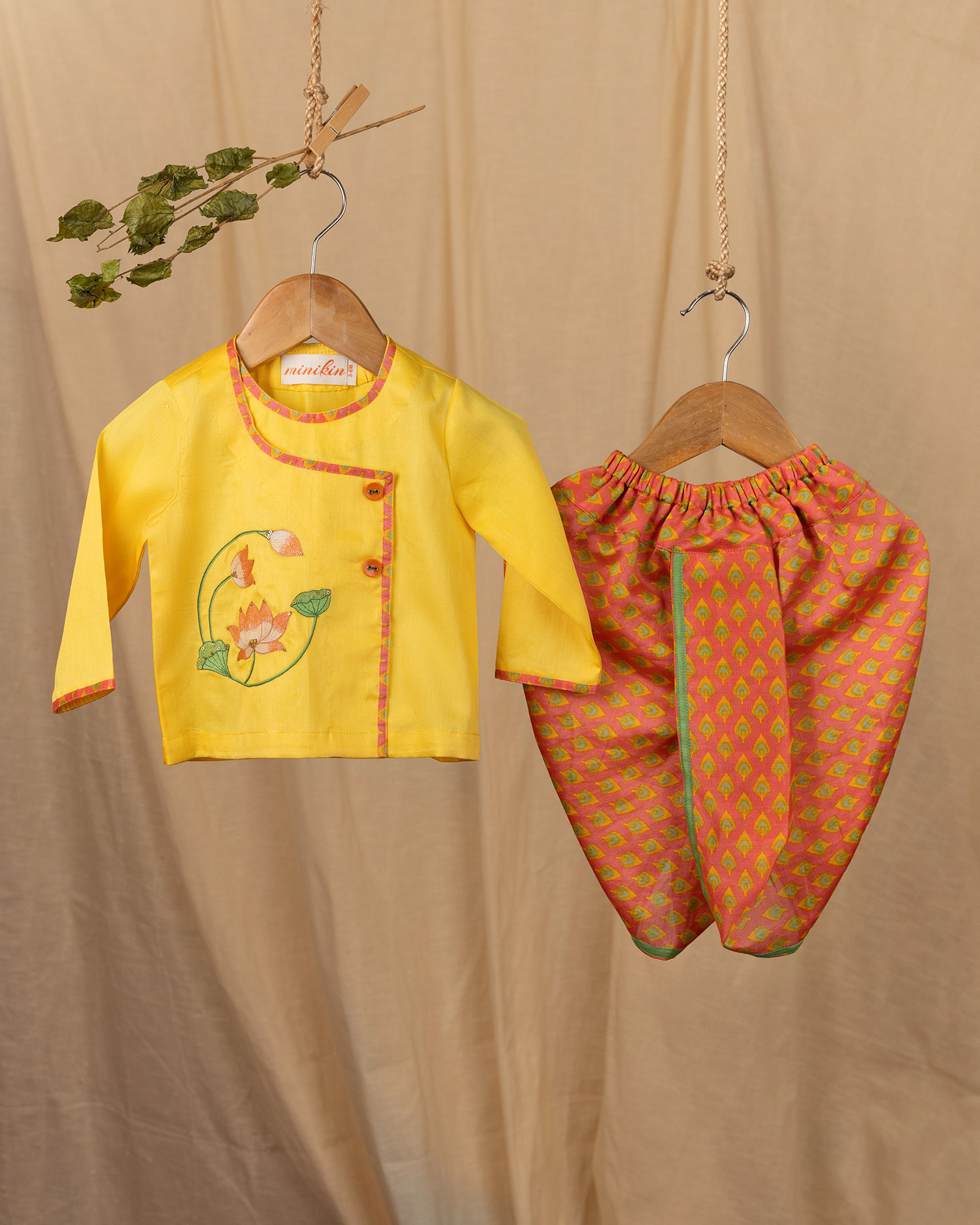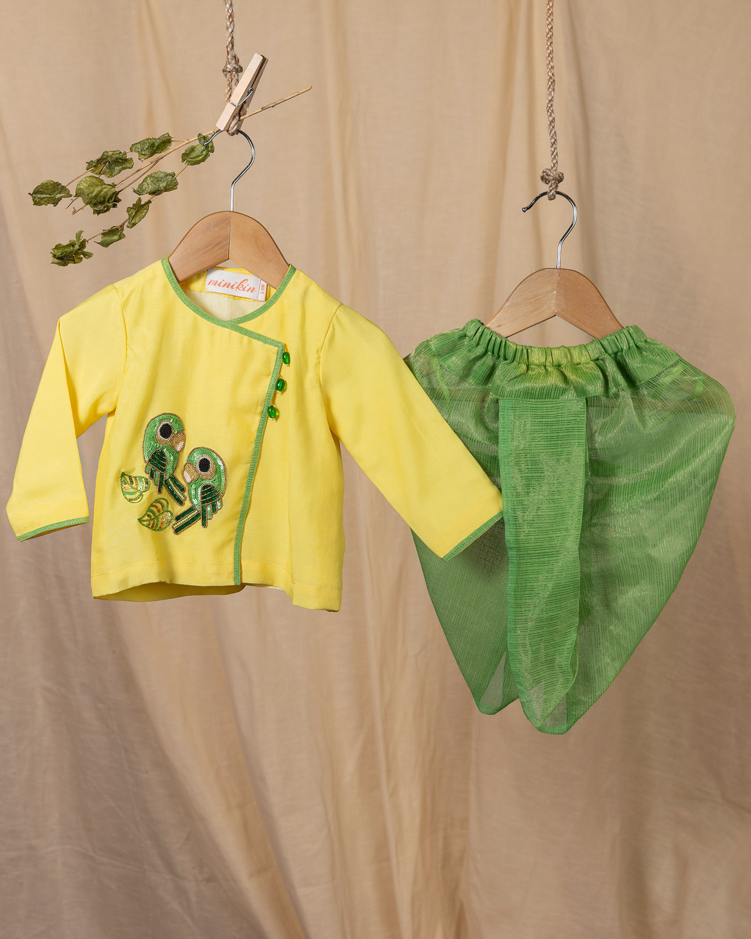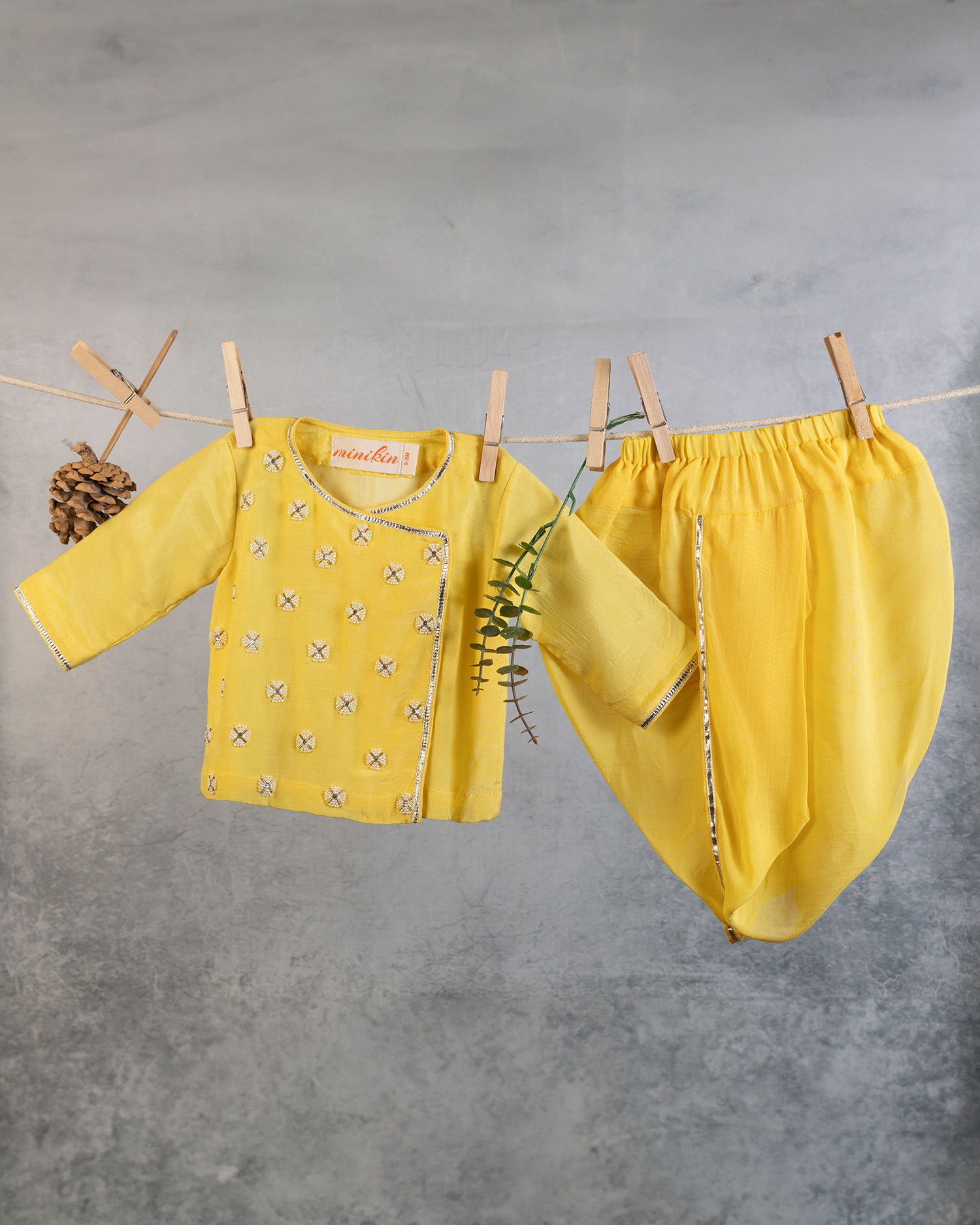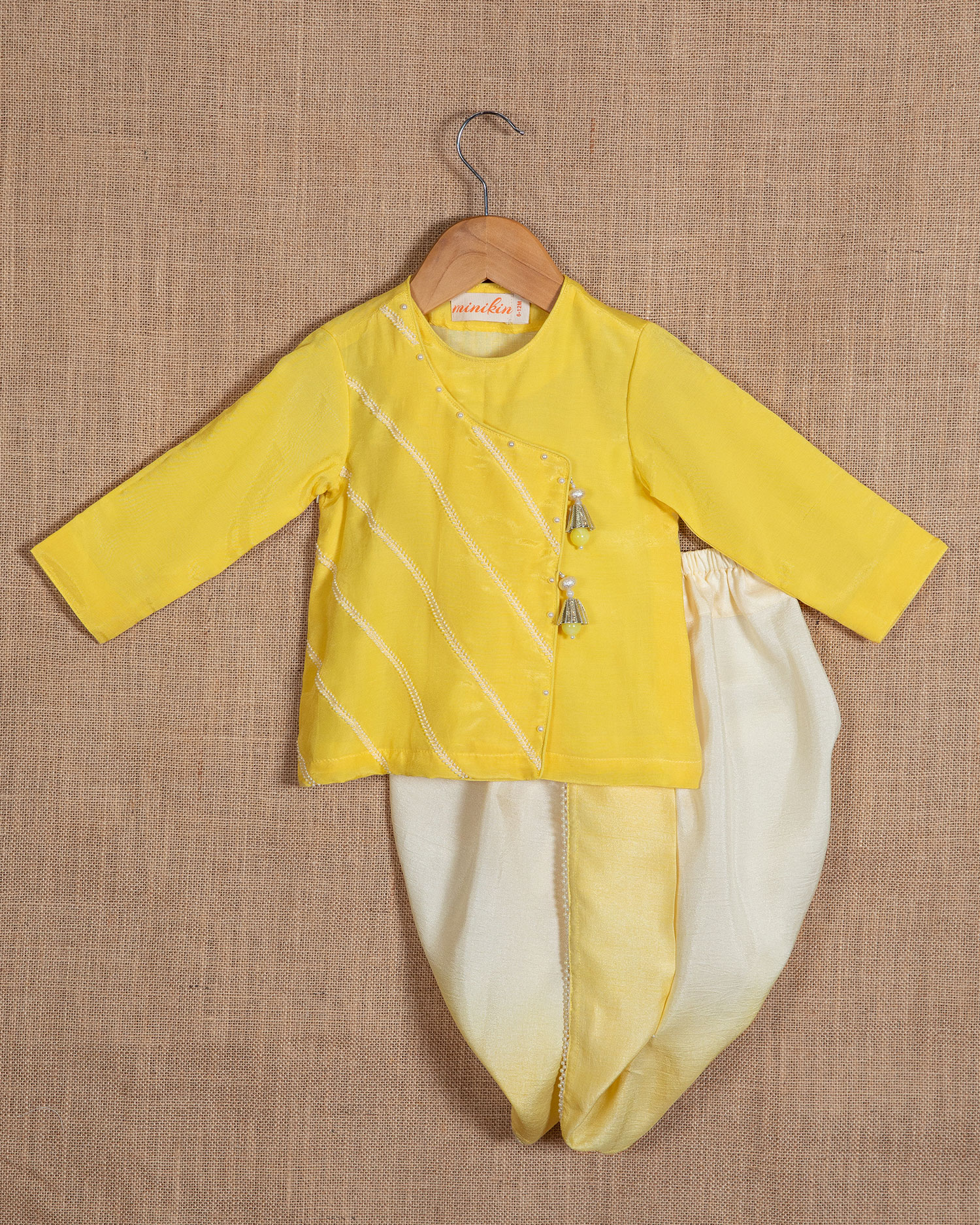 Yellow Pearl Embroidered Angarkha With Dhoti