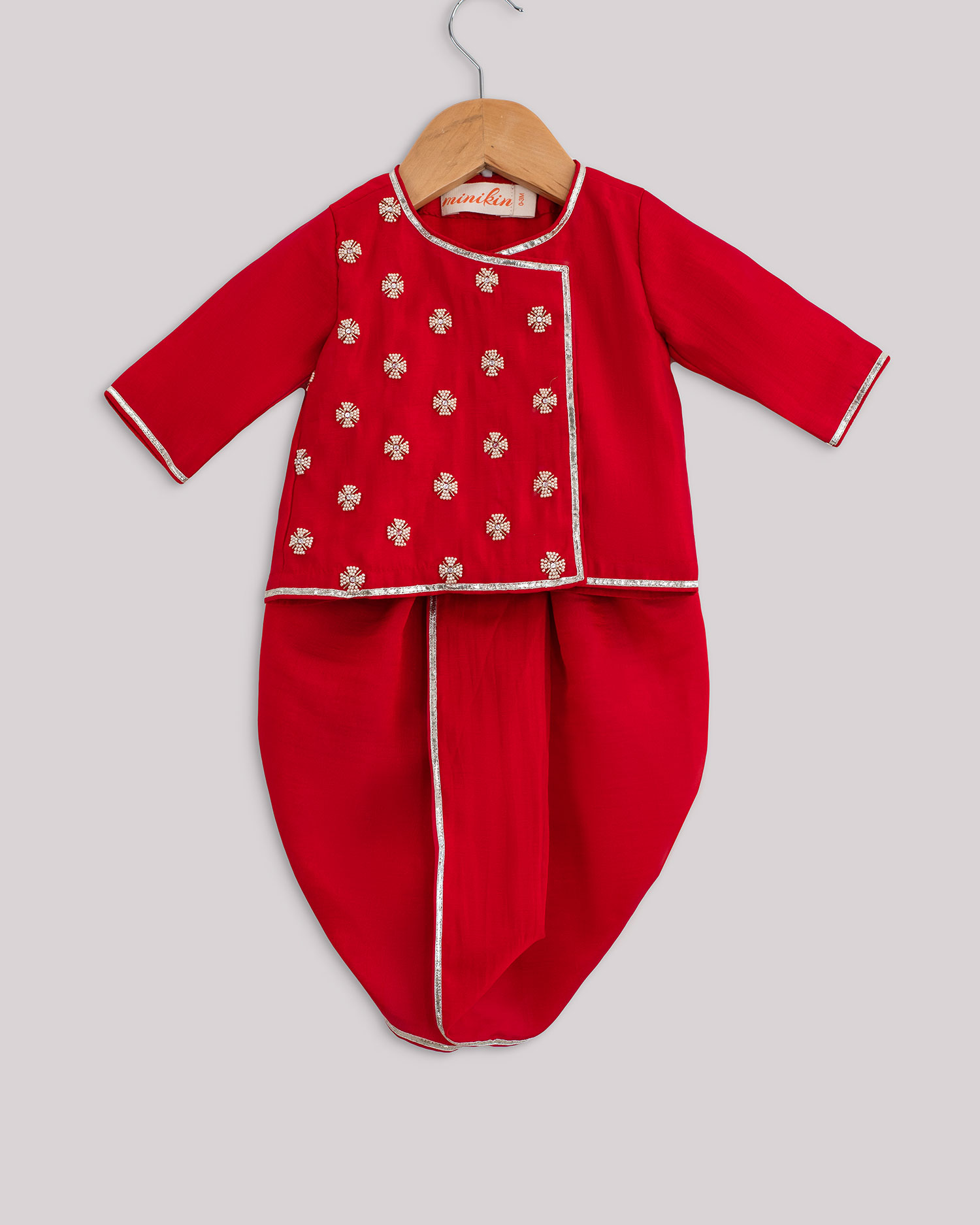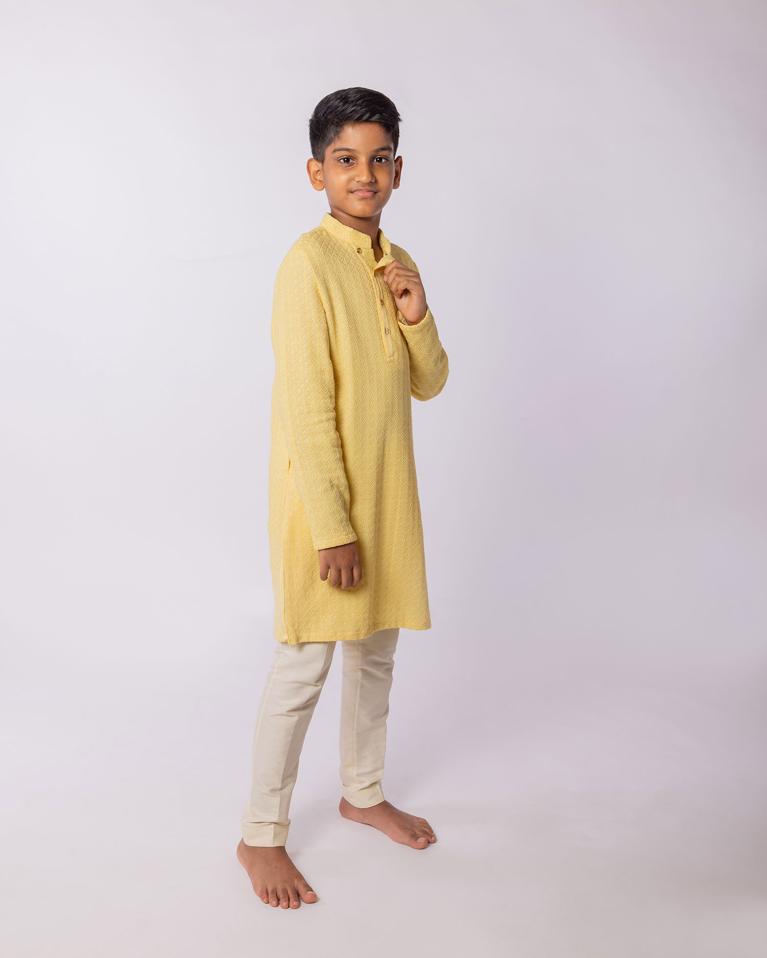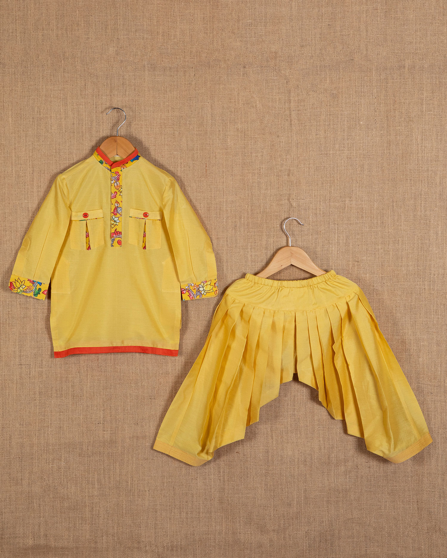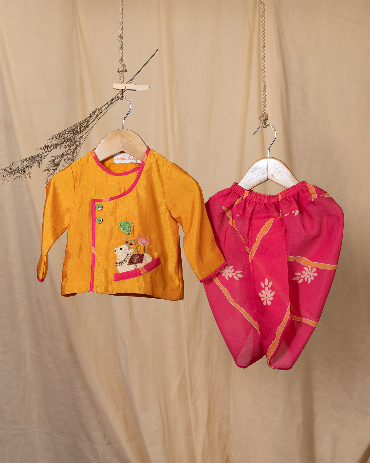 Yellow Pearl Embroidered Angarkha With Dhoti