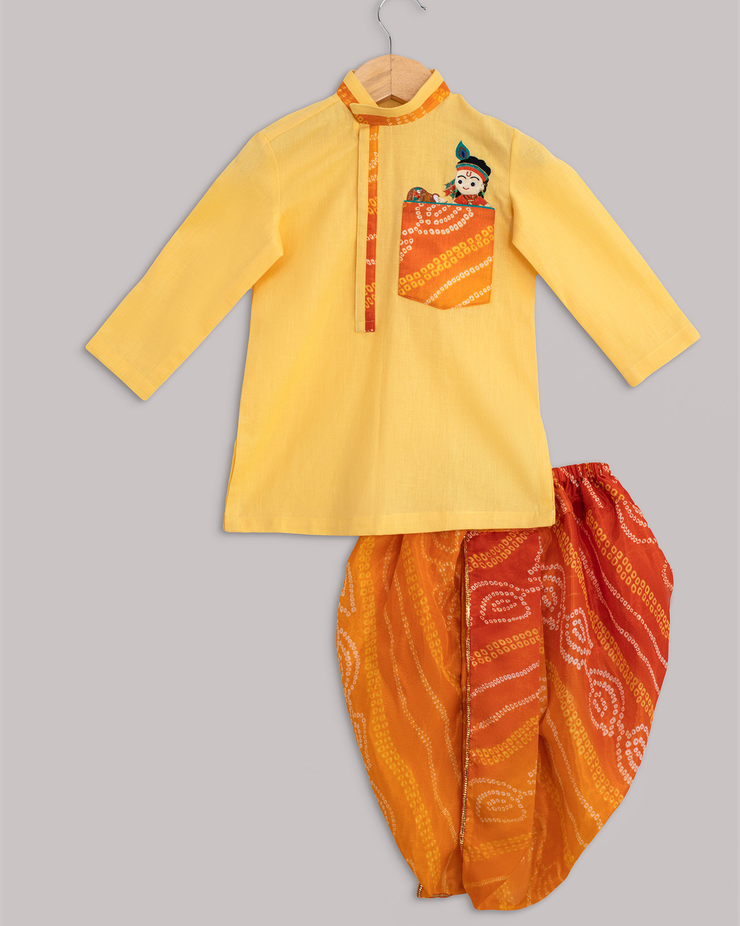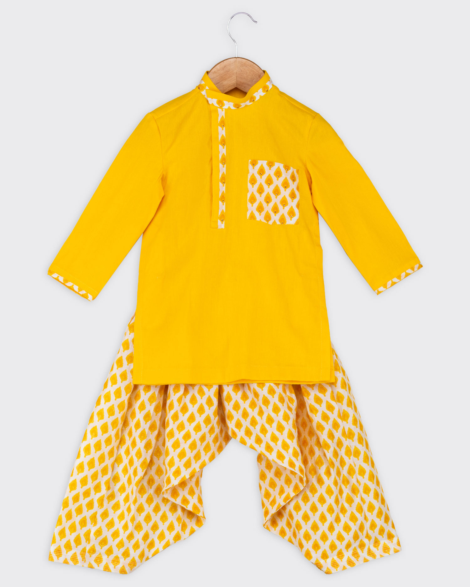 Yellow Pearl Embroidered Angarkha With Dhoti