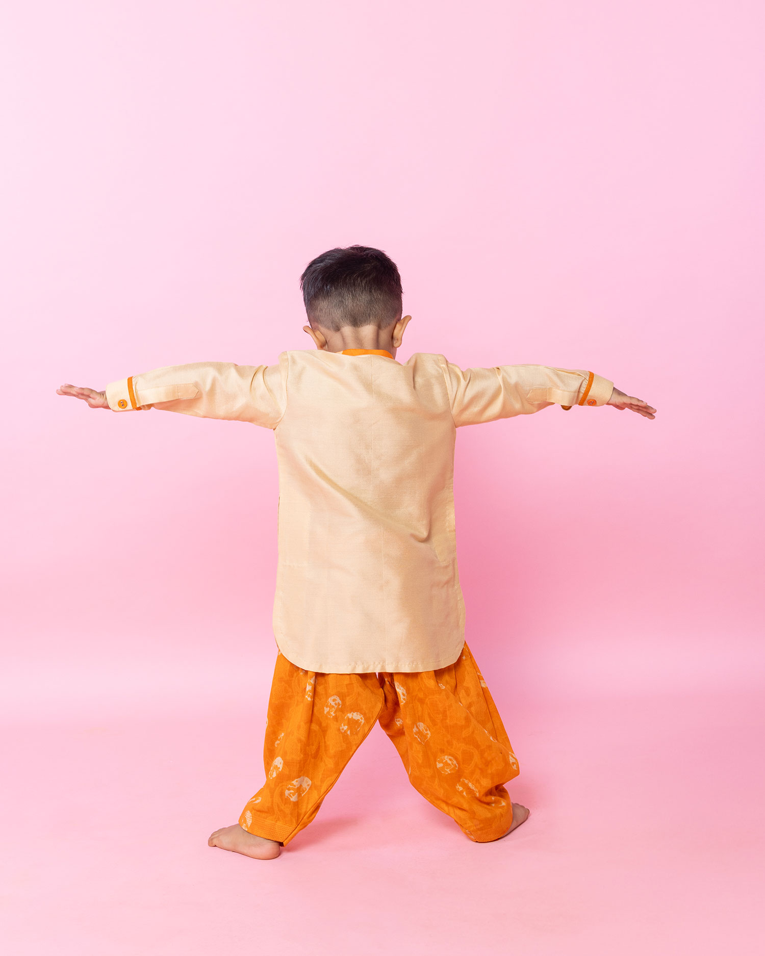 Beige cotton silk pathani with detailing on pockets paired with woven orange patiala.
