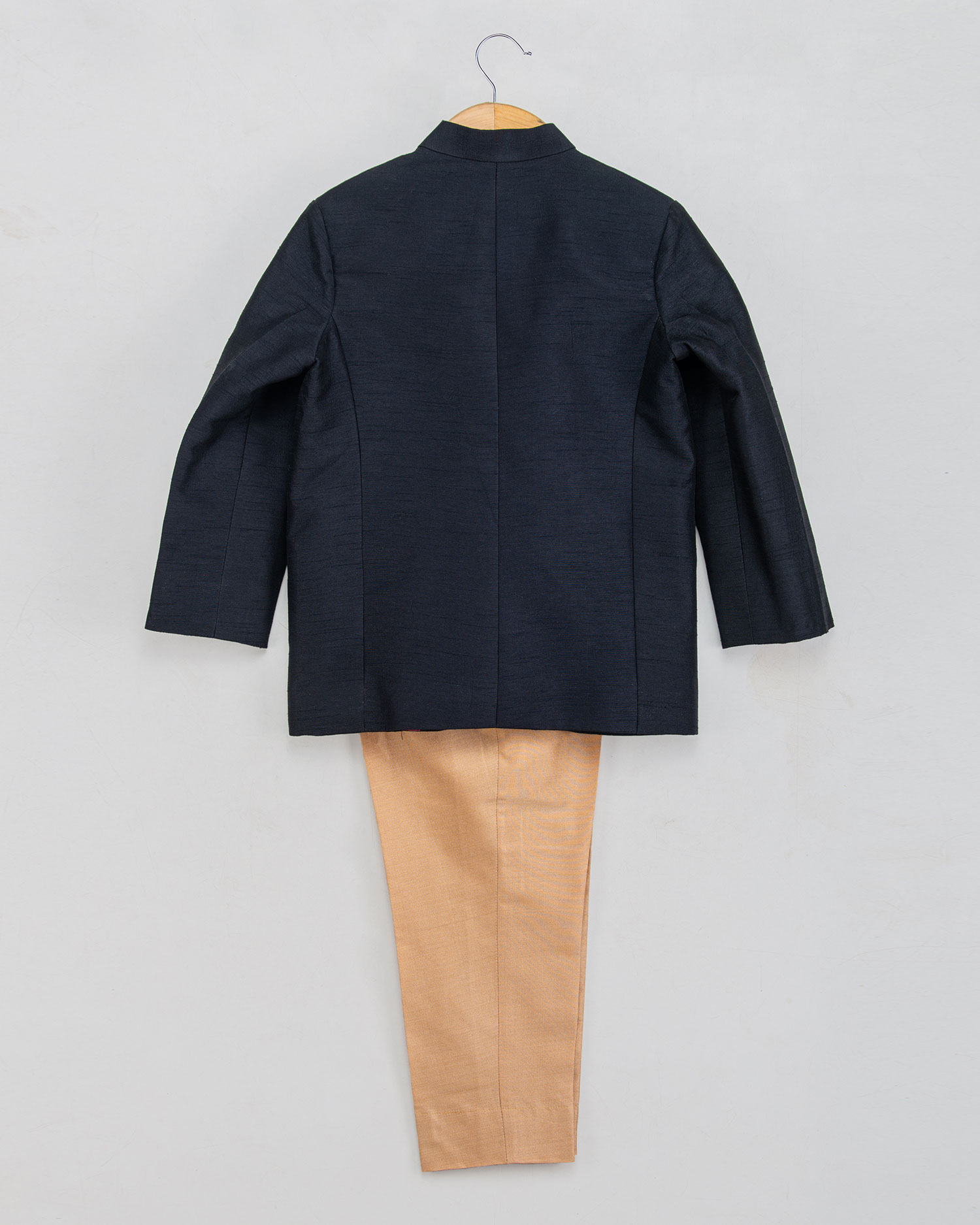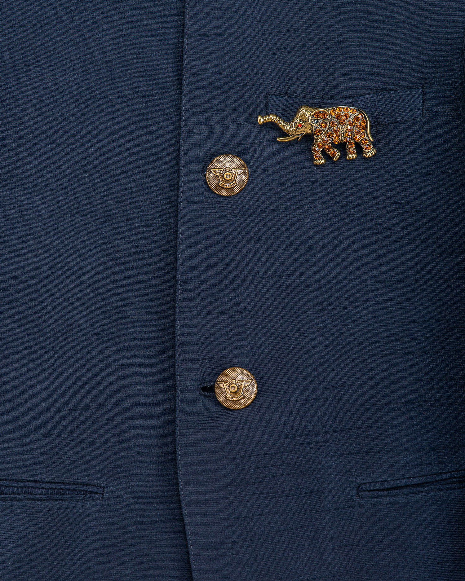 Black silk prince coat with elephant brroch paired with cotton silk pants