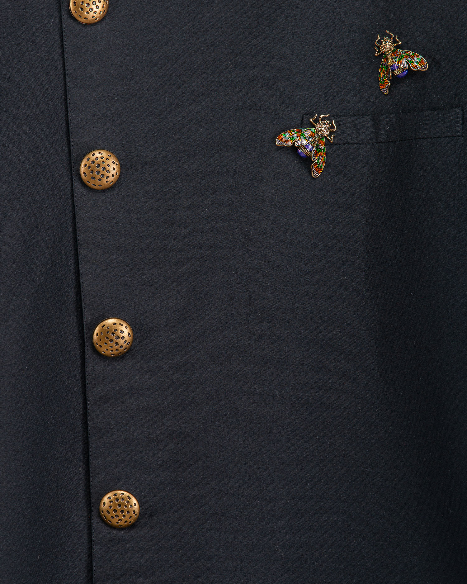 Black cotton silk sherwani with 2 bug brooces paired with cotton silk churidar