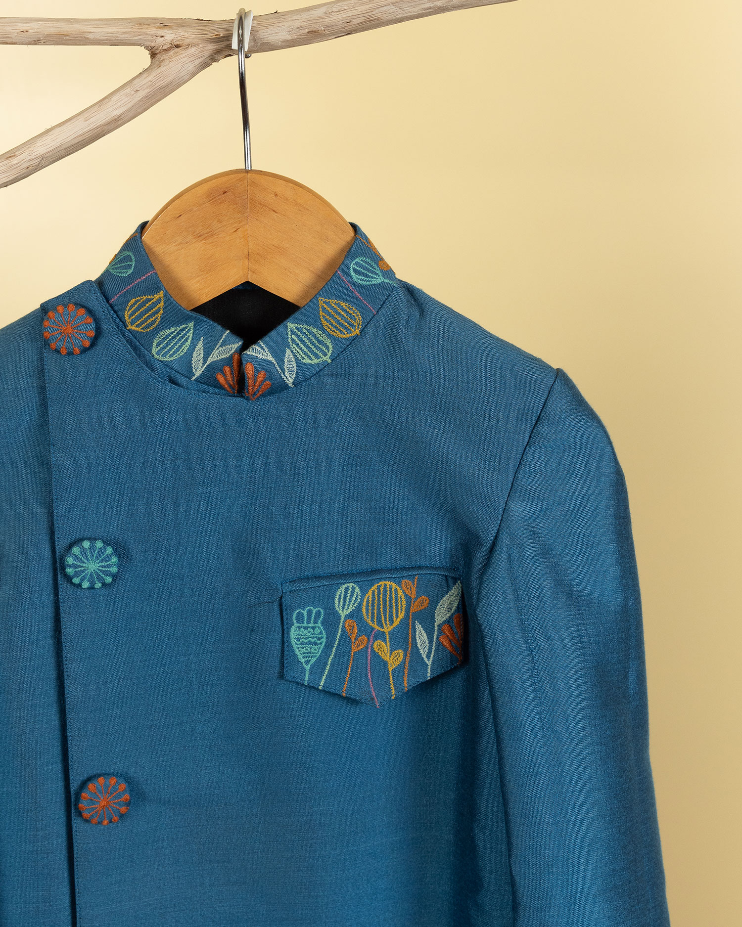 Blue cotton silk sherwani with multi coloured machine embroidery paired with pant.