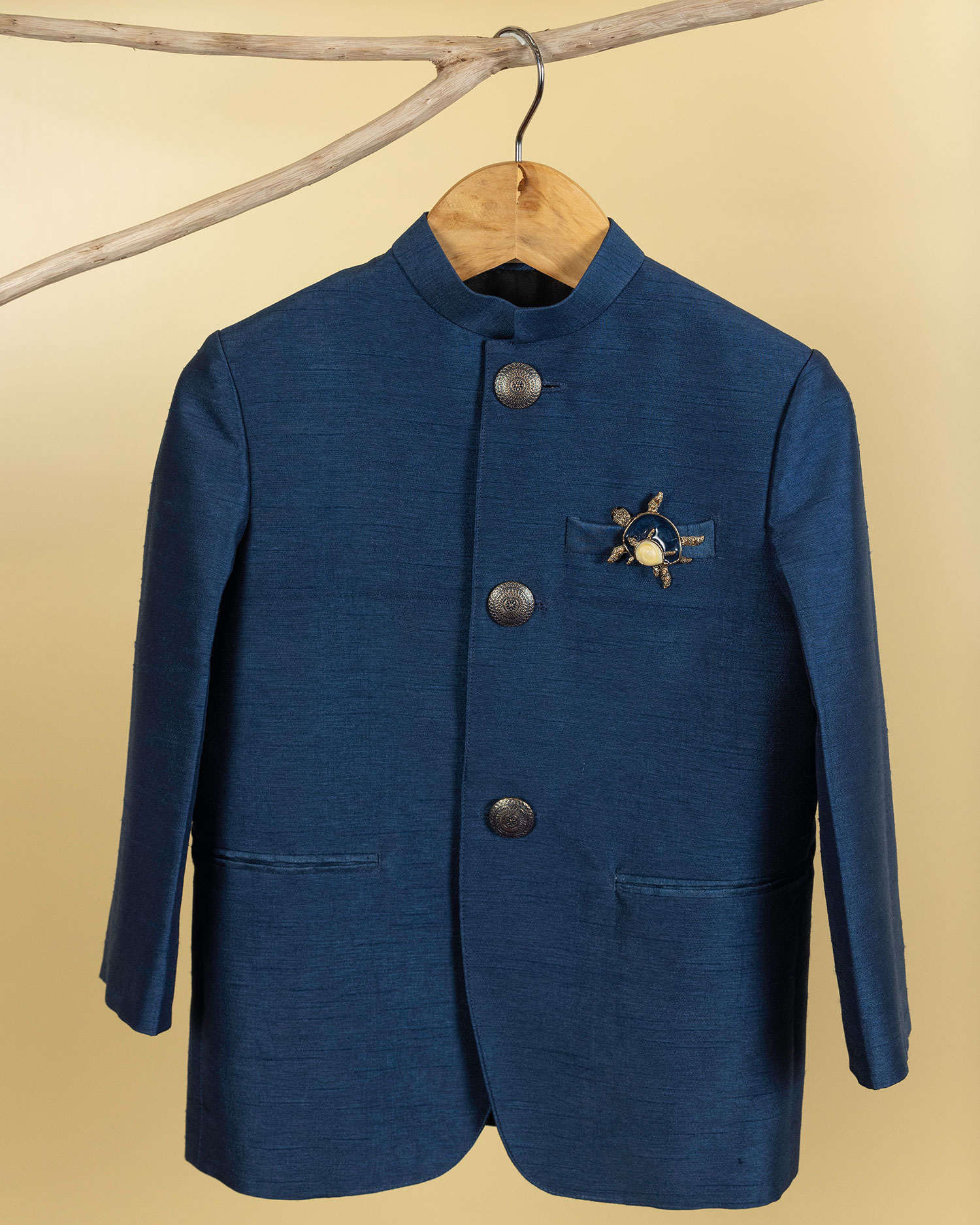 Blue silk prince coat embellished with turtle brooch and paired with black pant