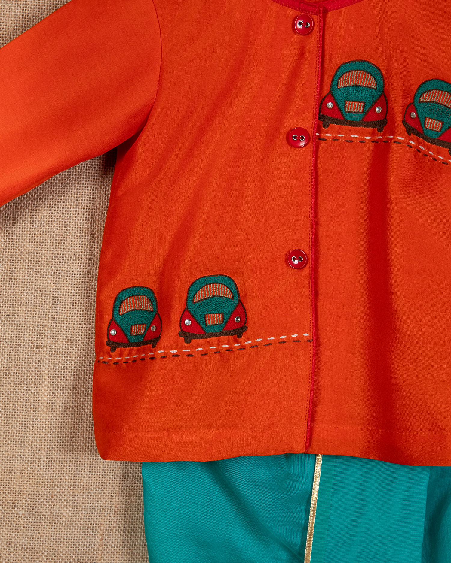 Orange cotton silk angarkha with hand embroidered car motifs paired with turquoise chanderi dhoti