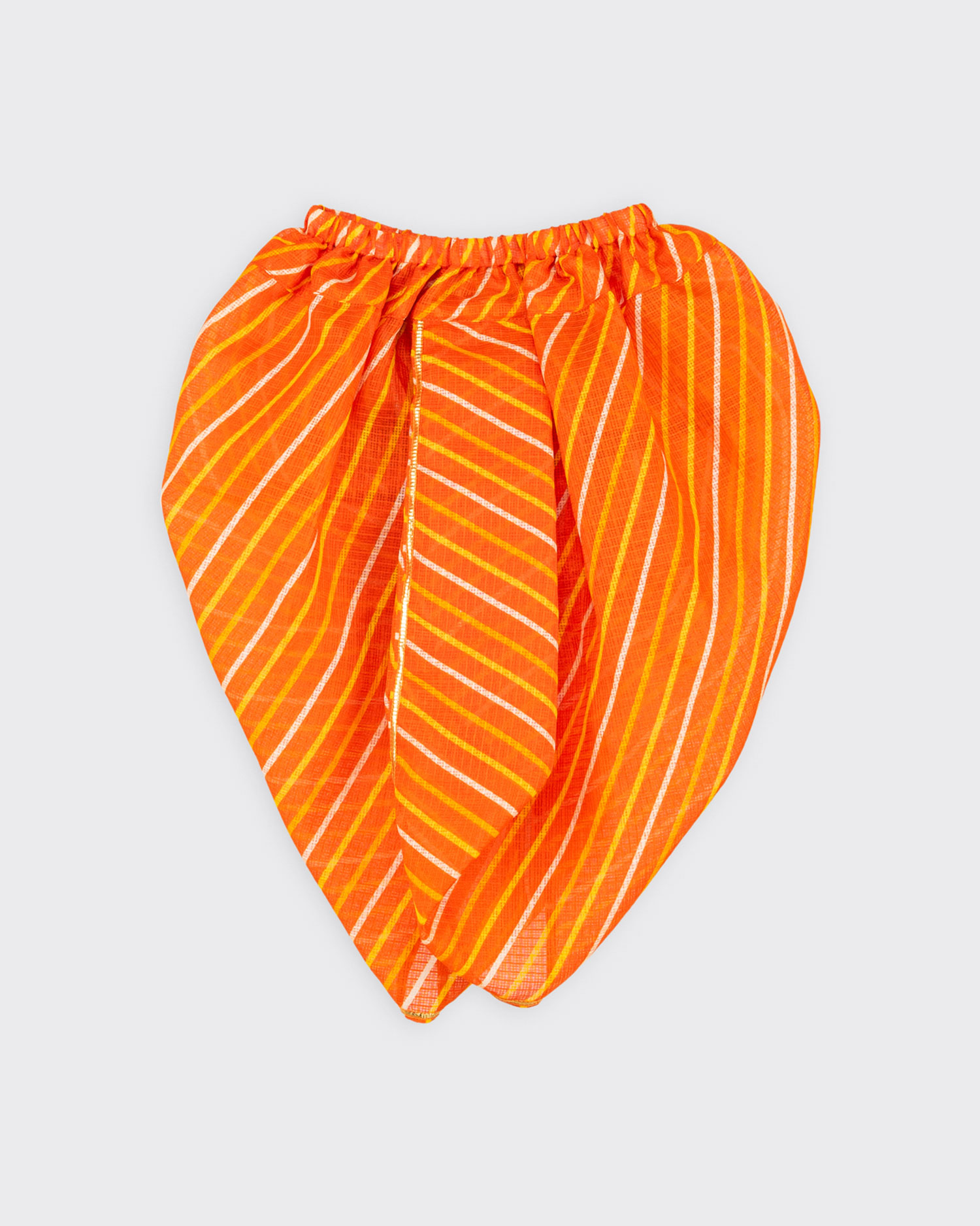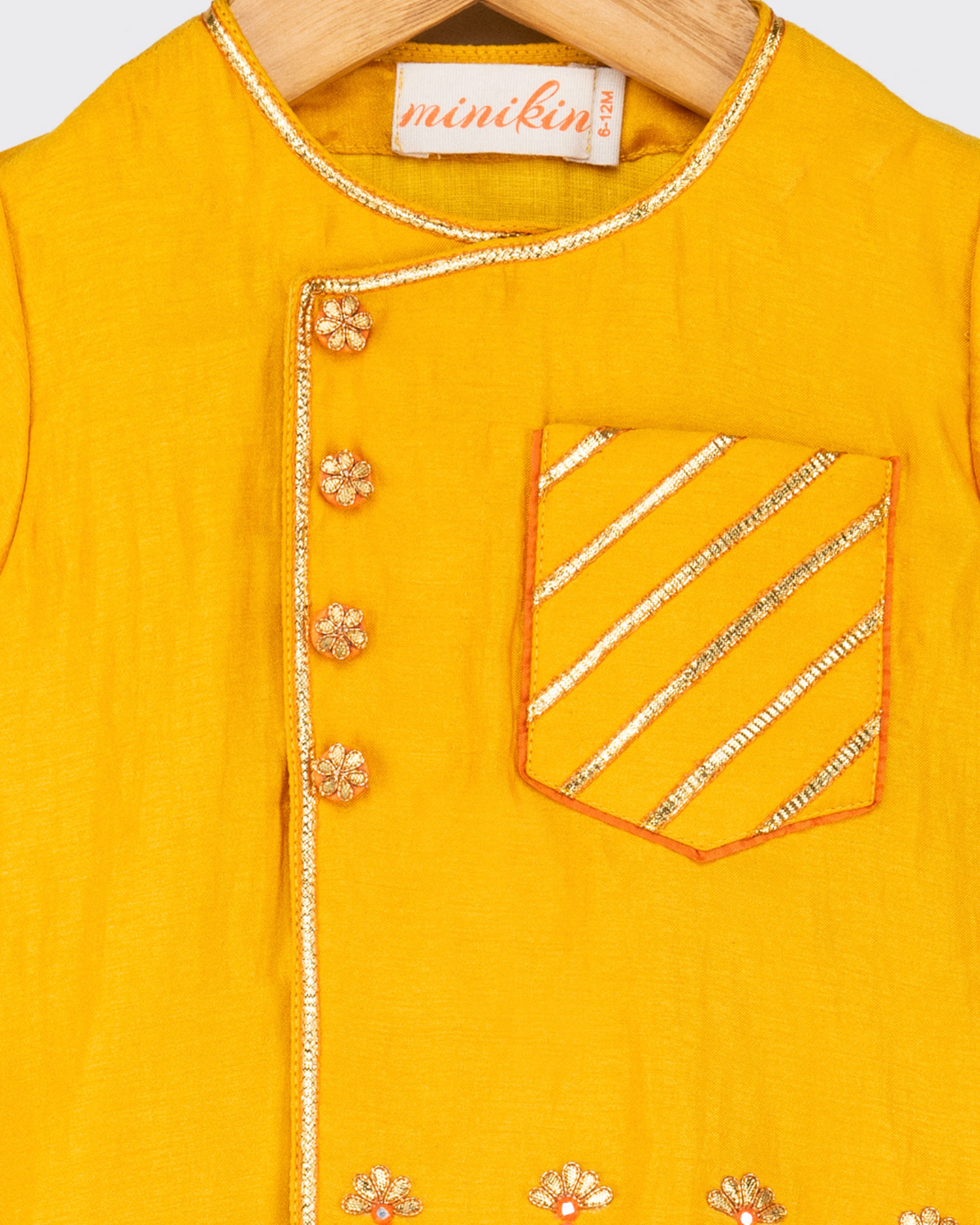 Golden yellow cotton silk angarkha with hand embroidered gota patti work paired with leheriya print dhoti