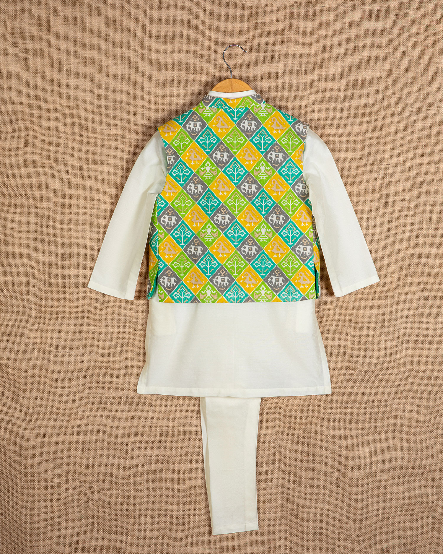 Green jacket with patola print paired with offwhite cotton silk kurta and churidar