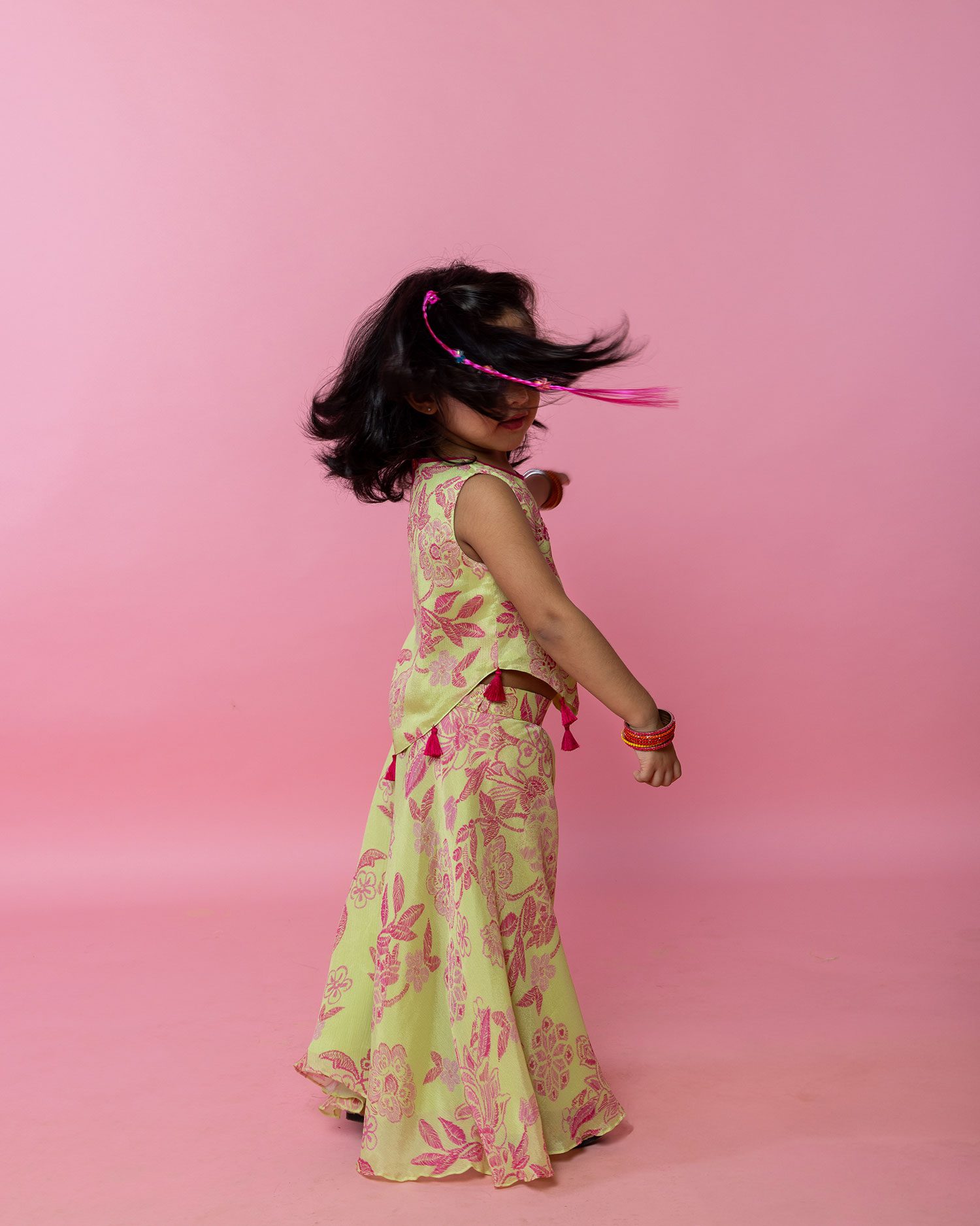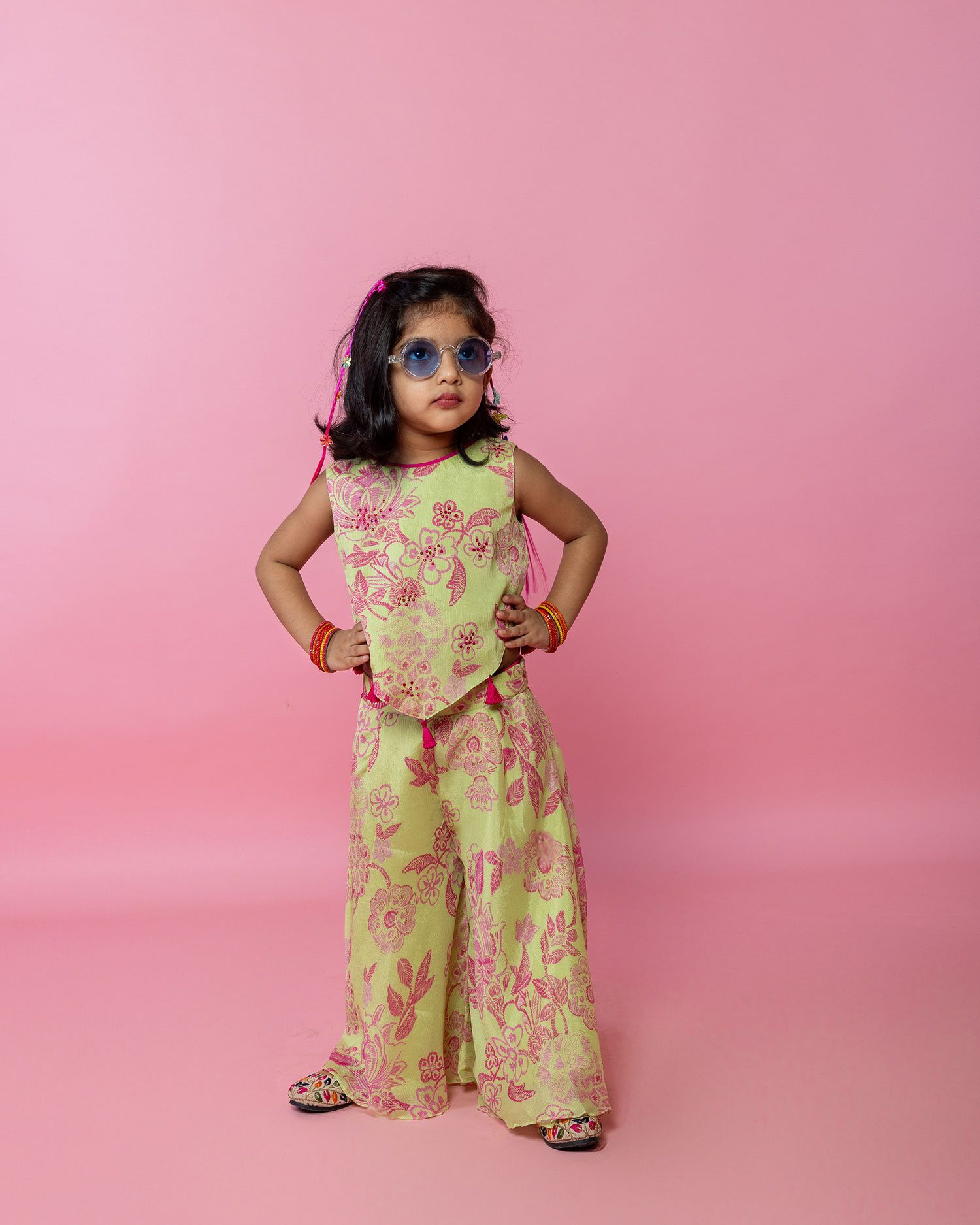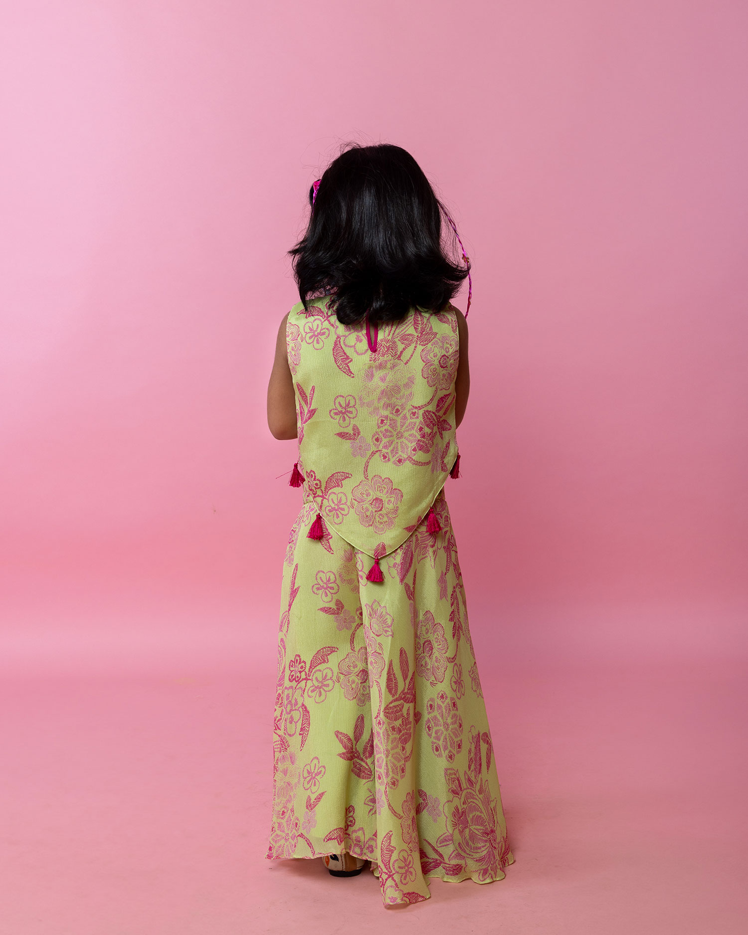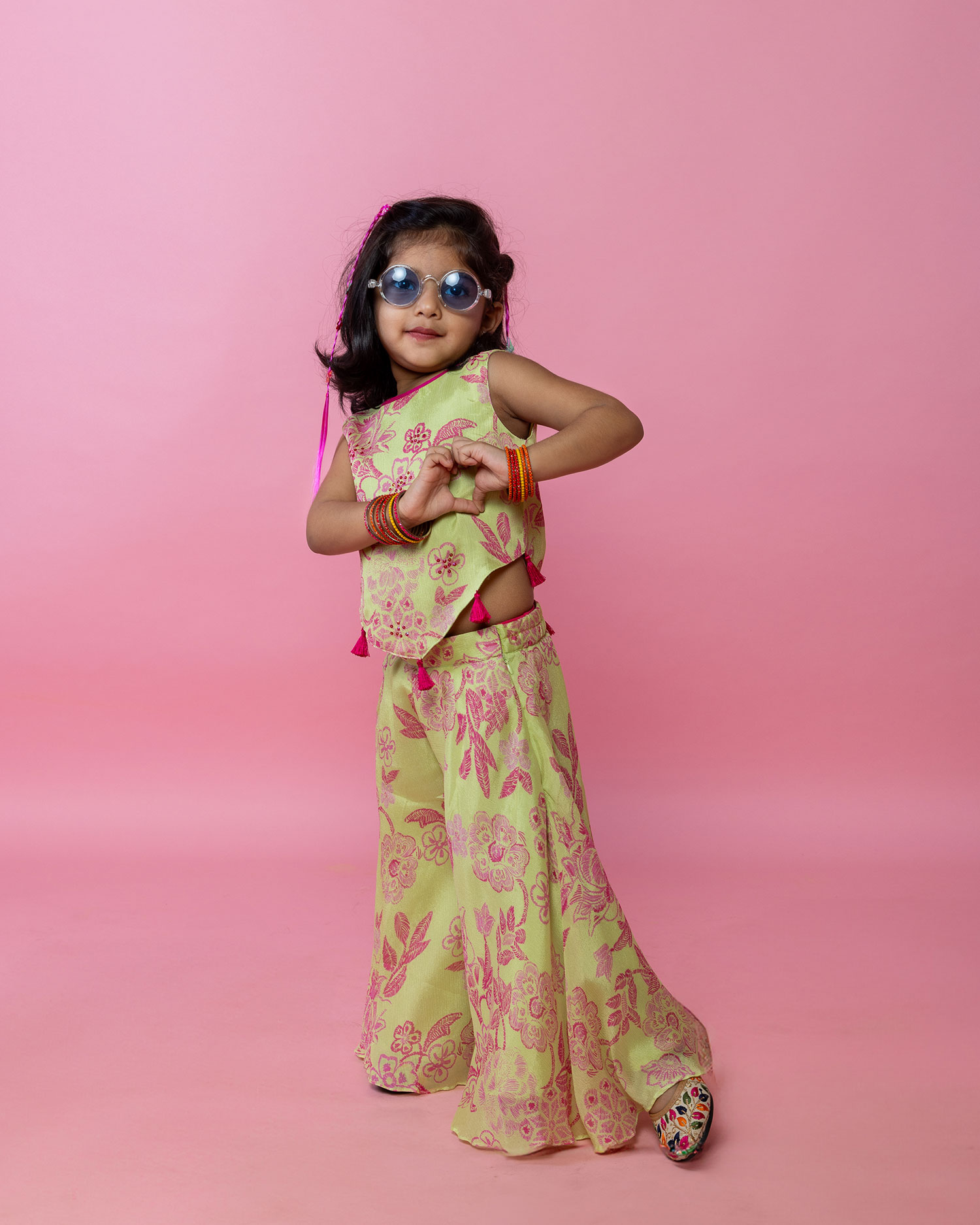 Lime green pink georgette printed palazzo paired with same print top with tassel detailing and sequin embellishment.