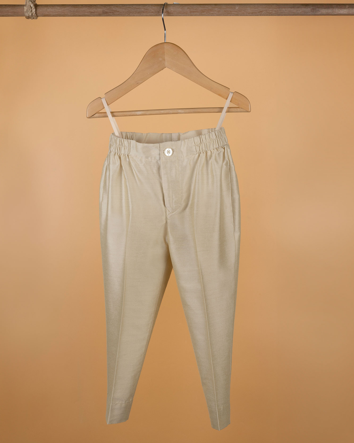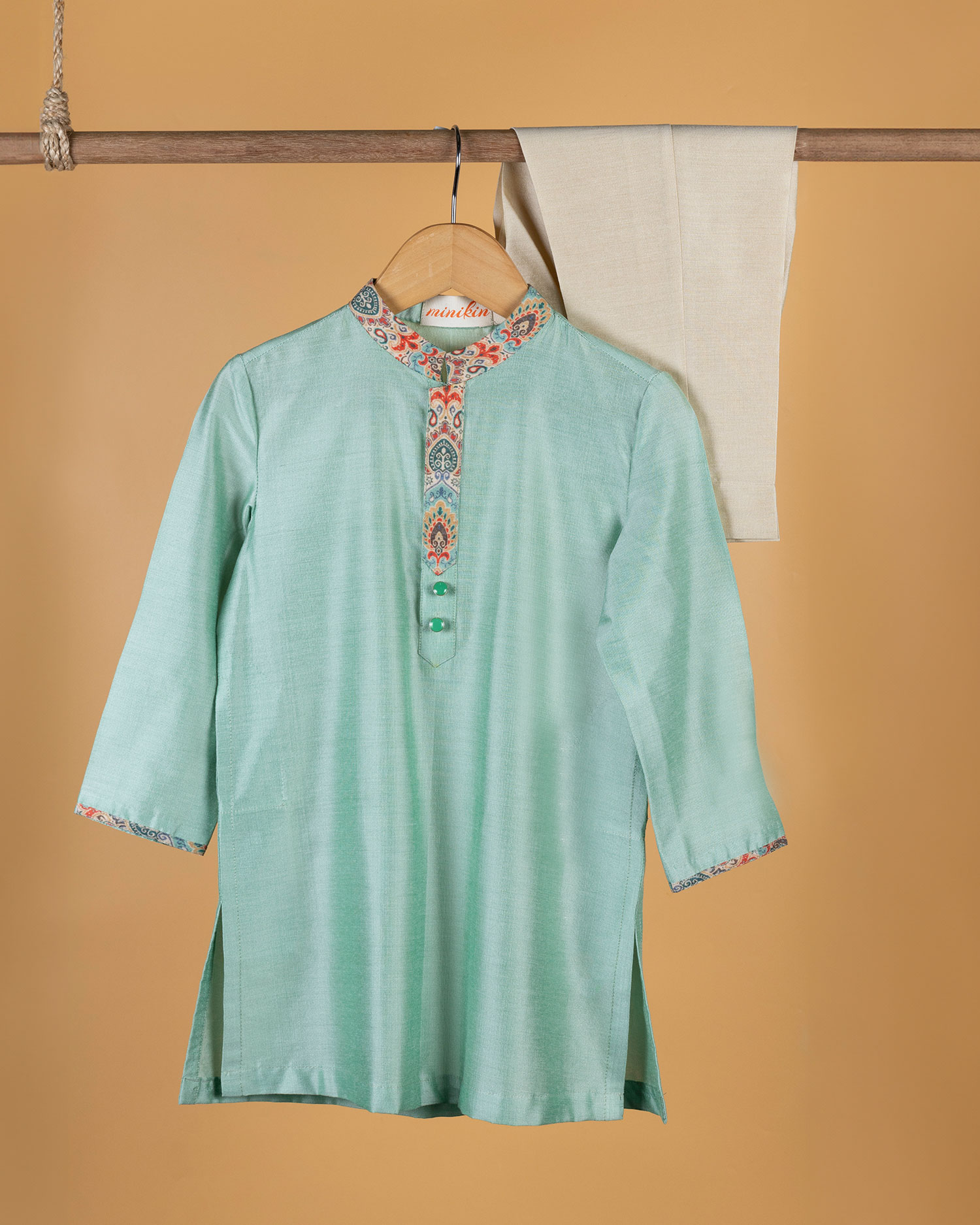 Jamevar print cotton linen jacket paired with sea green cotton silk kurta and beige pants.
