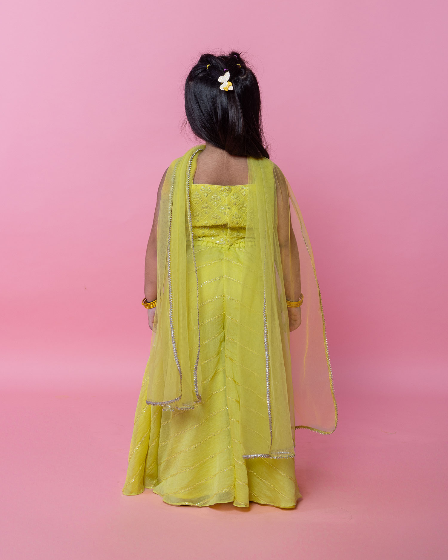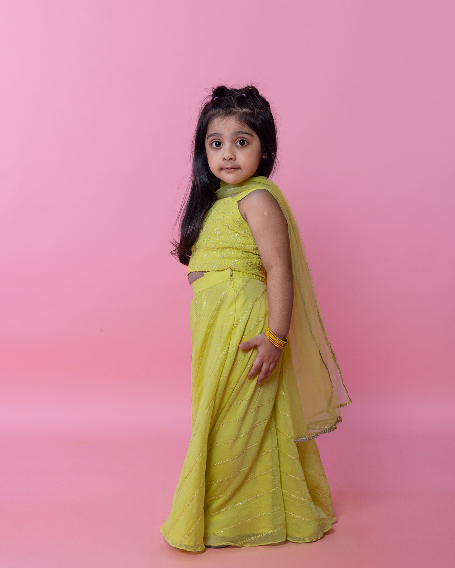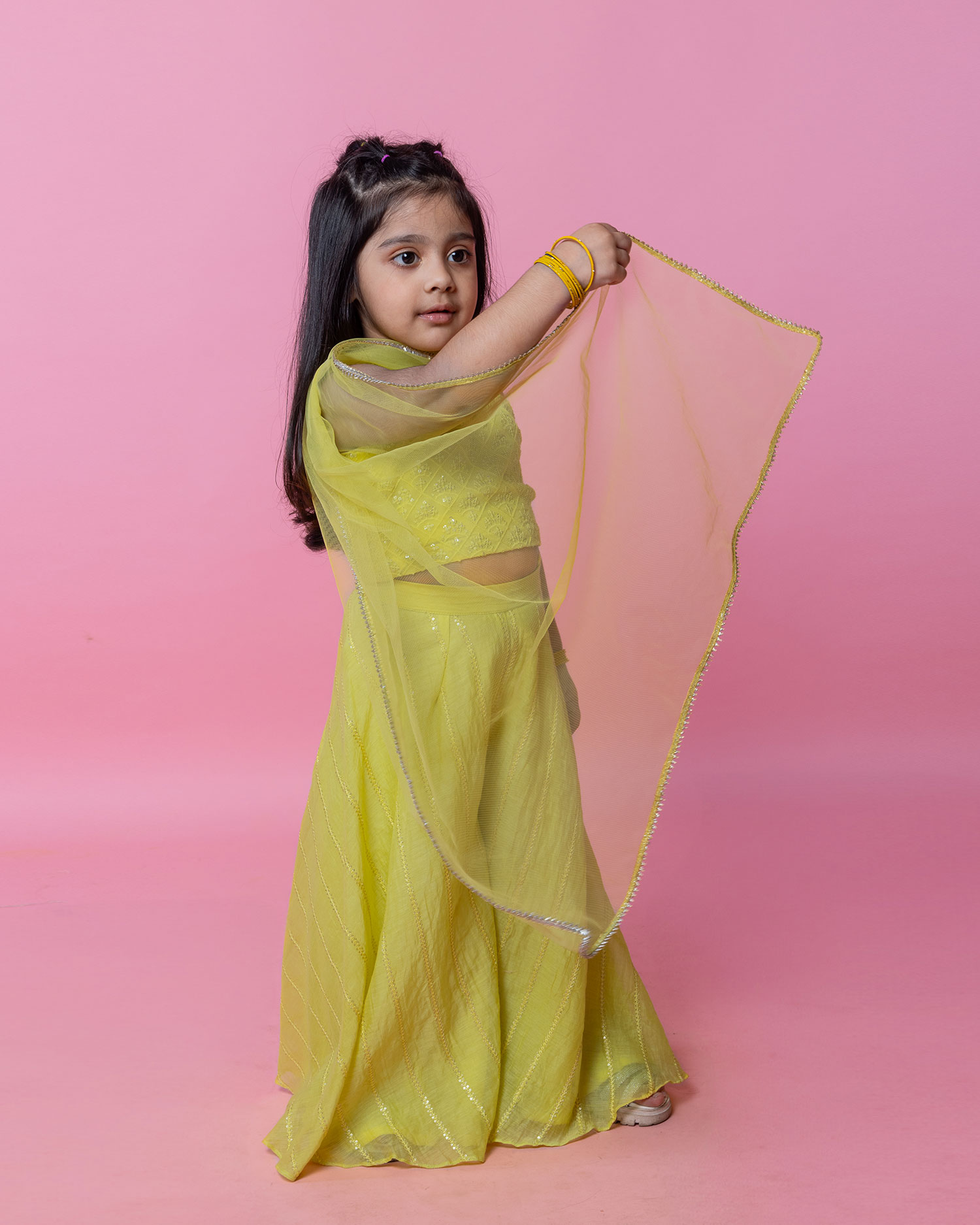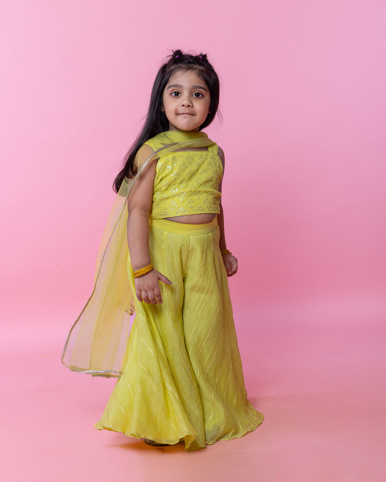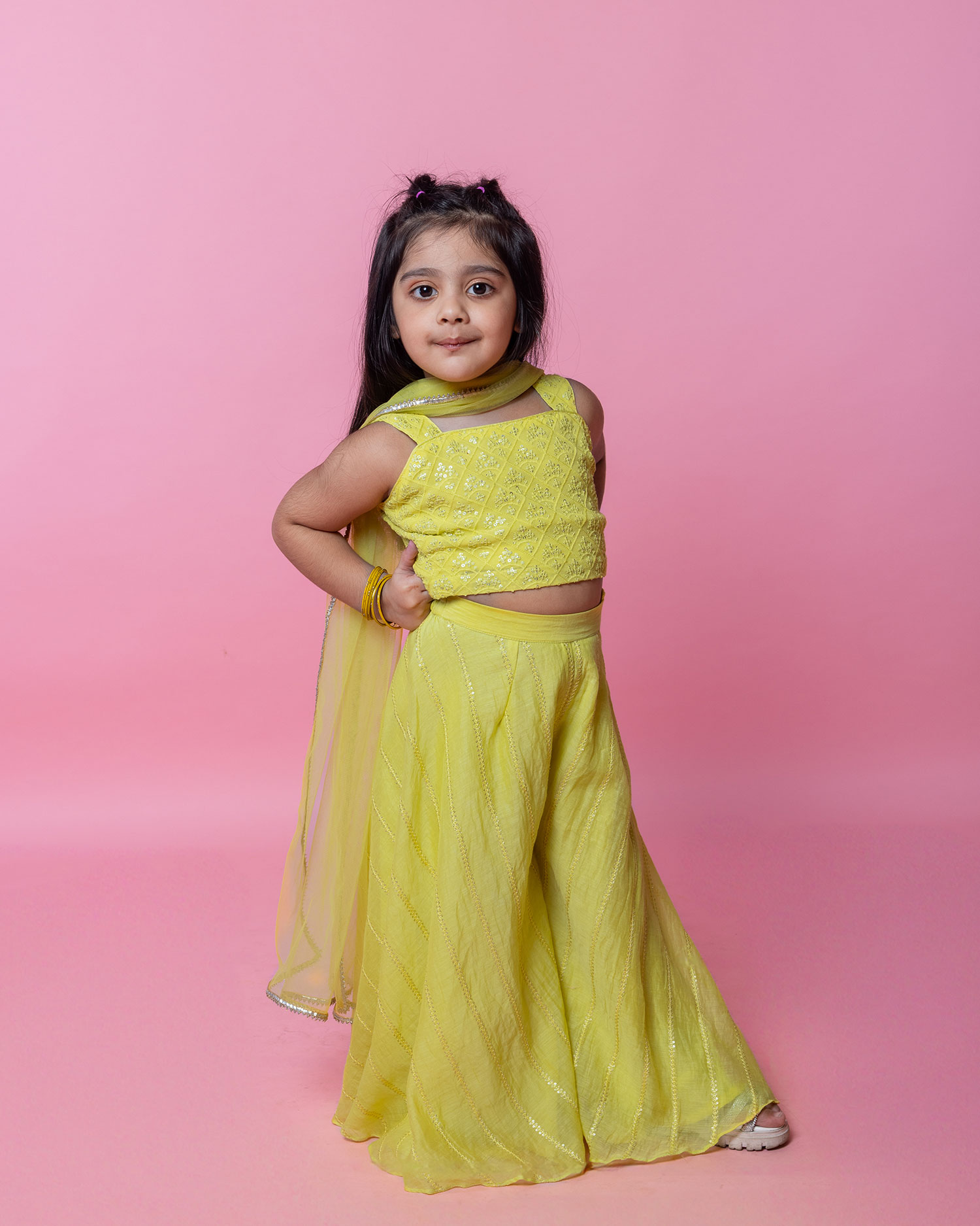 Lime green georgette chikenkari top paired with chanderi silk palazzo with sequin embroidery paired with a net dupatta with gota lace detail.