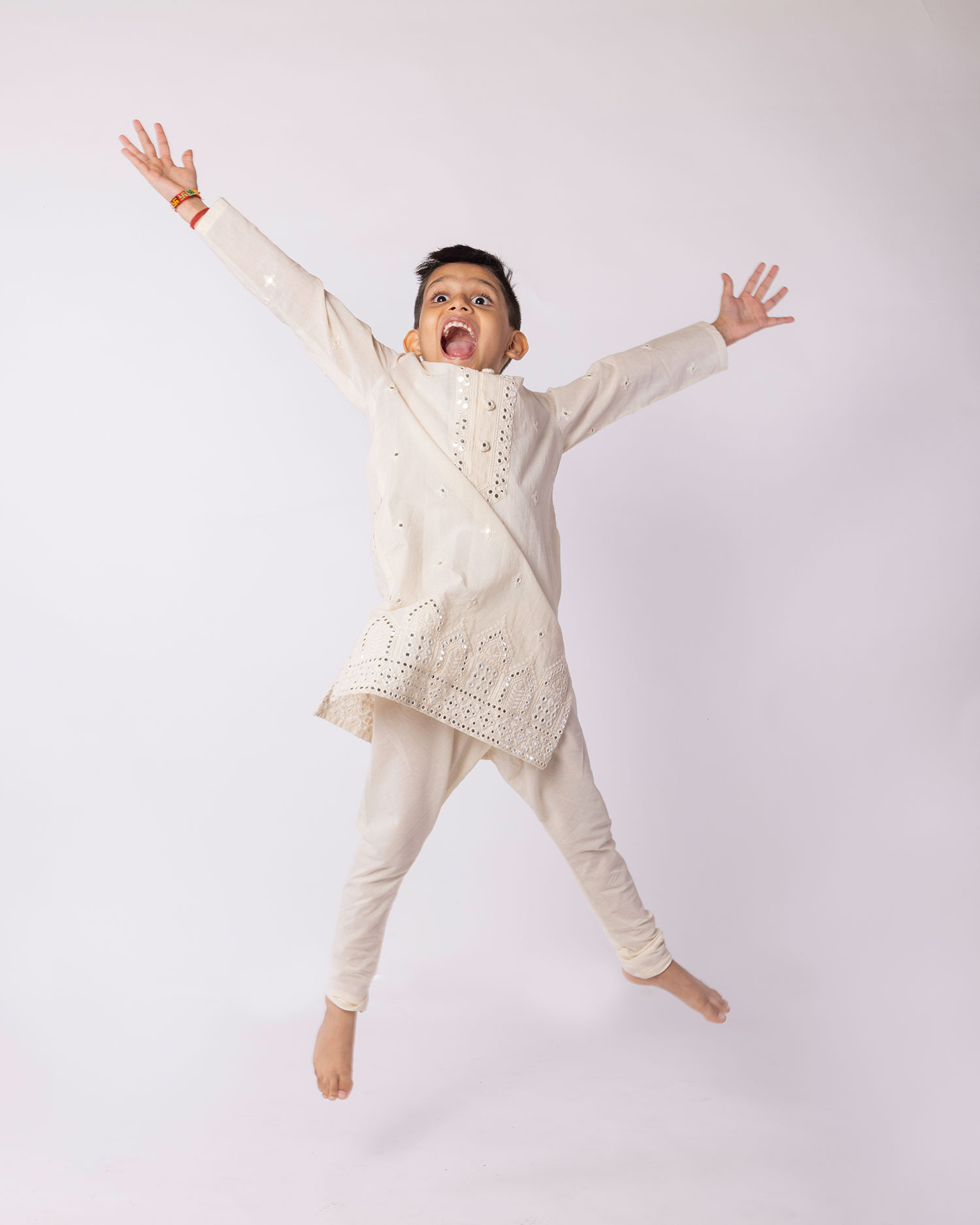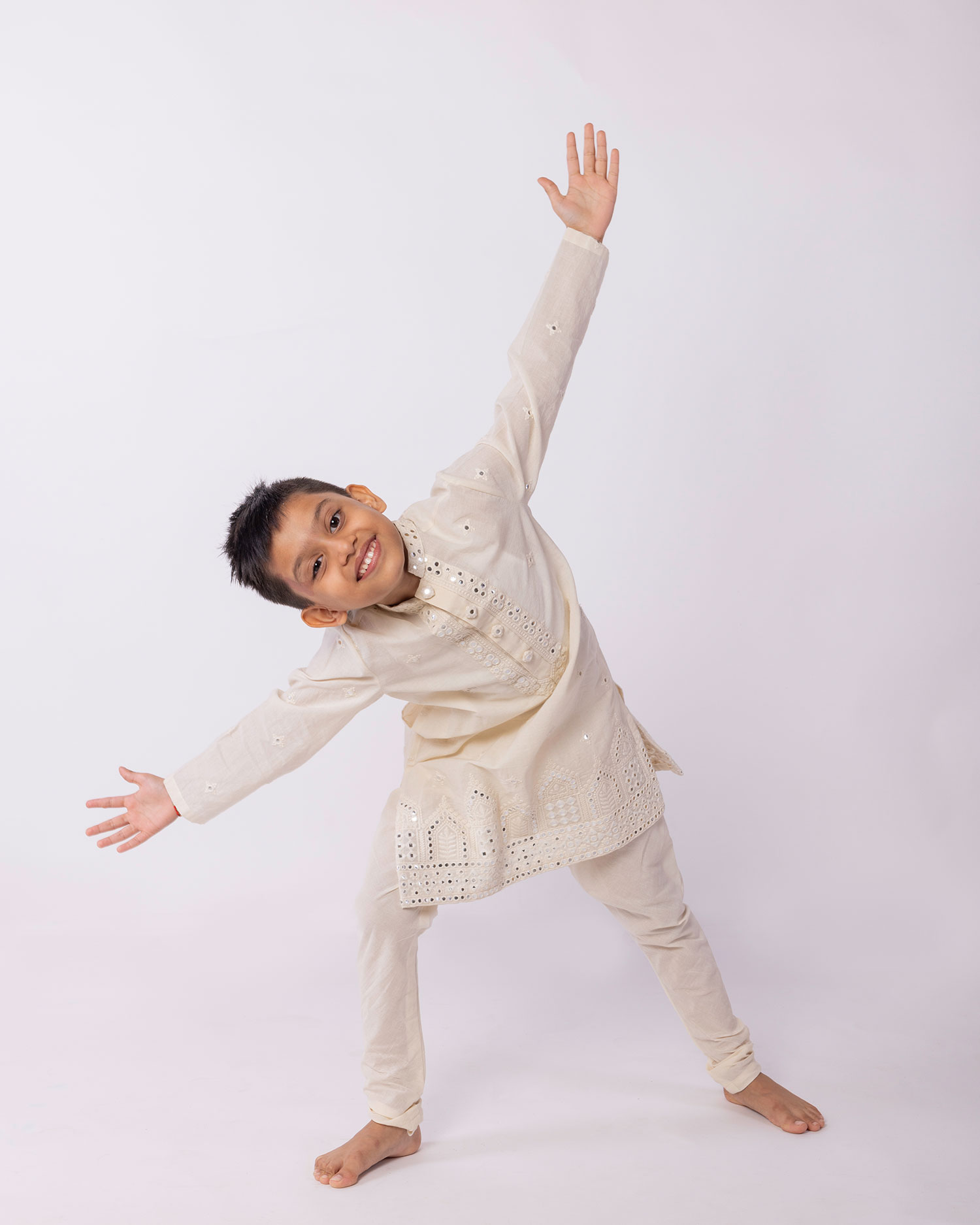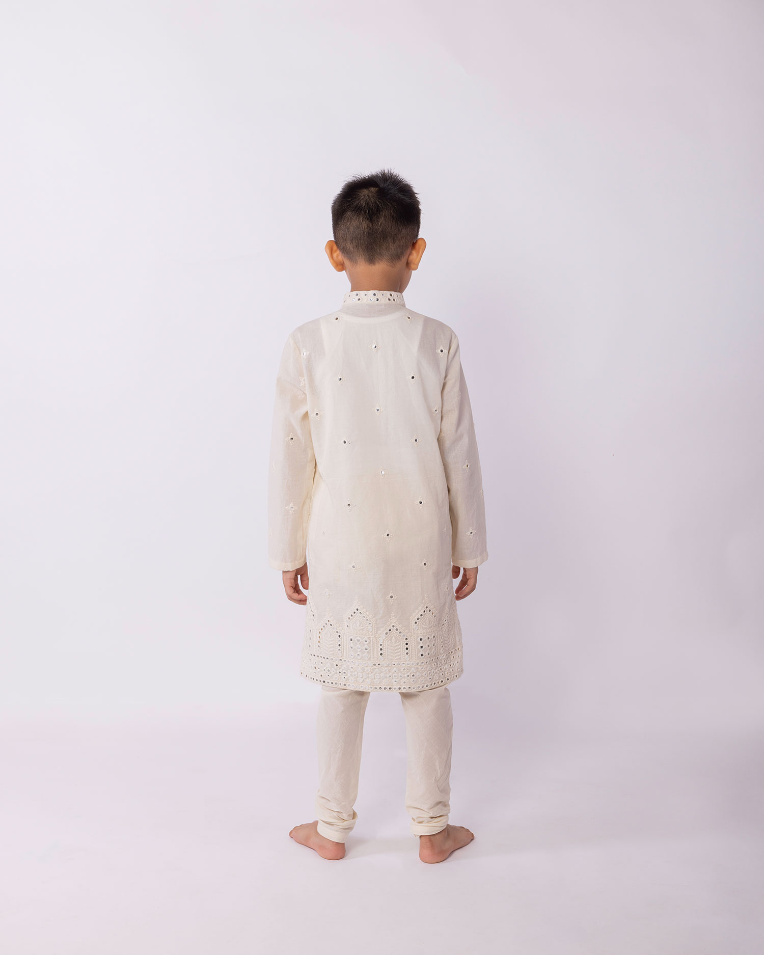 Cream cotton embroidered mirror work kurta paired with cotton churidar.