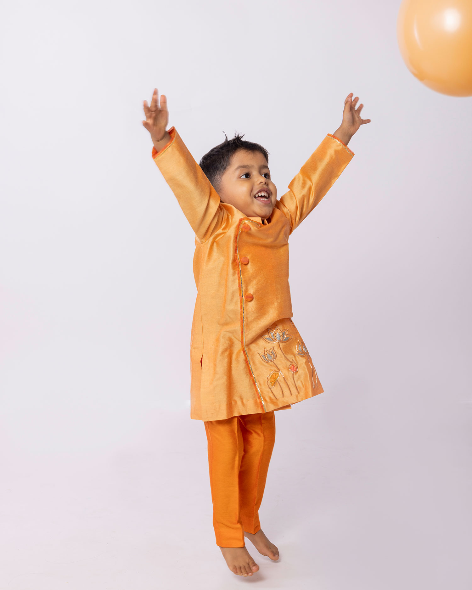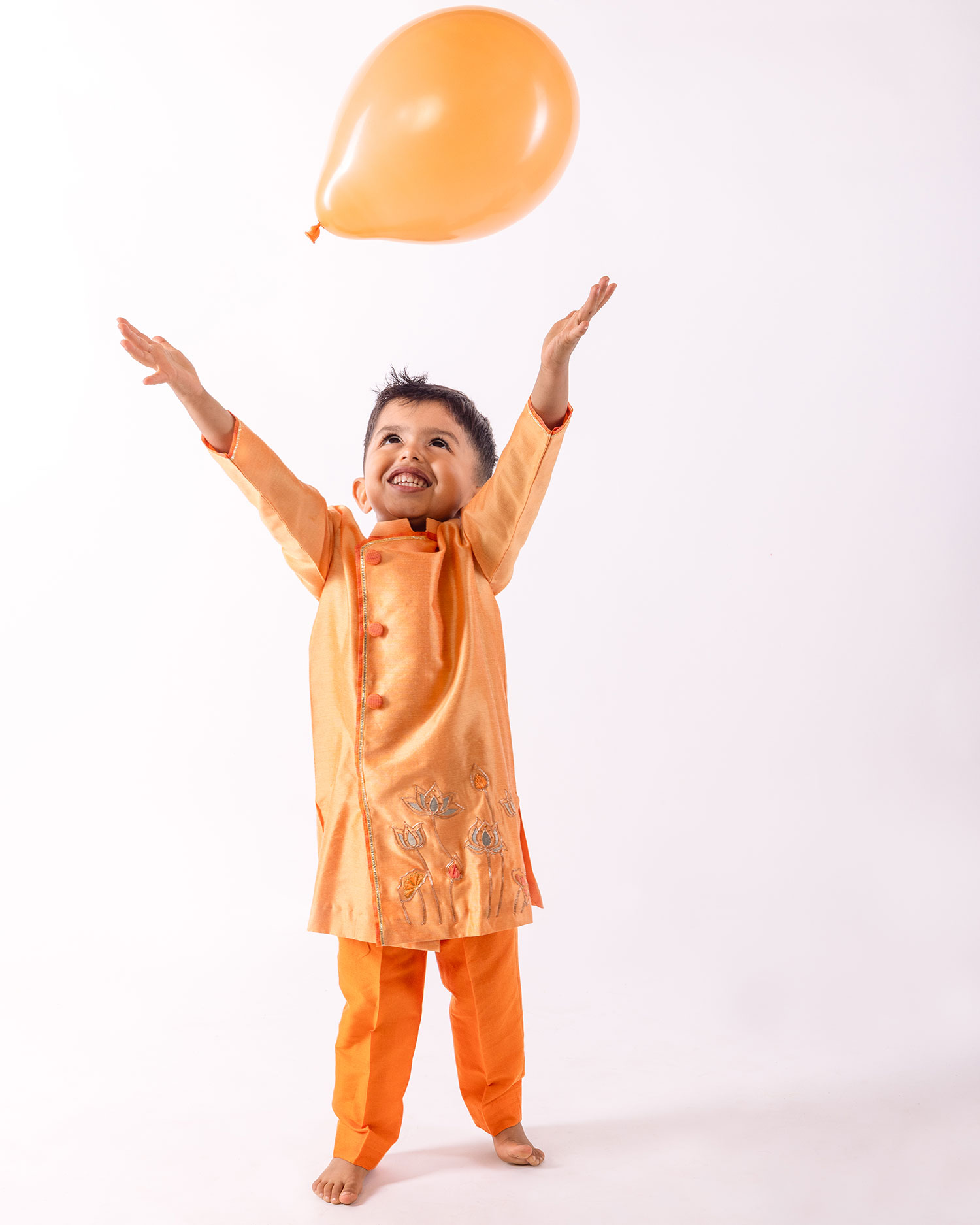 Orange cotton silk kurta with hand embroidered gota patti lotus motifs paired with pants.