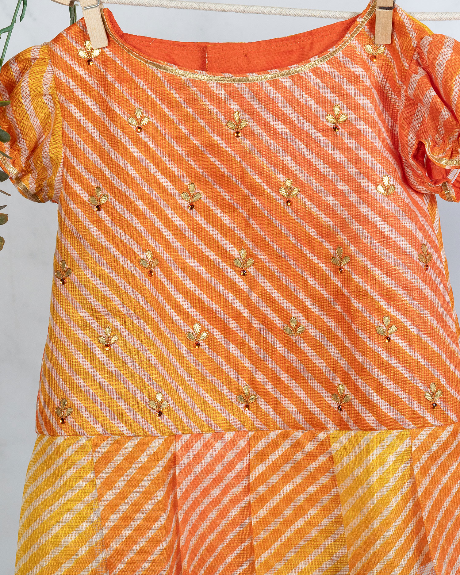 Orange leheriya frock with hand embroidered gota motifs paired with bloomers.
