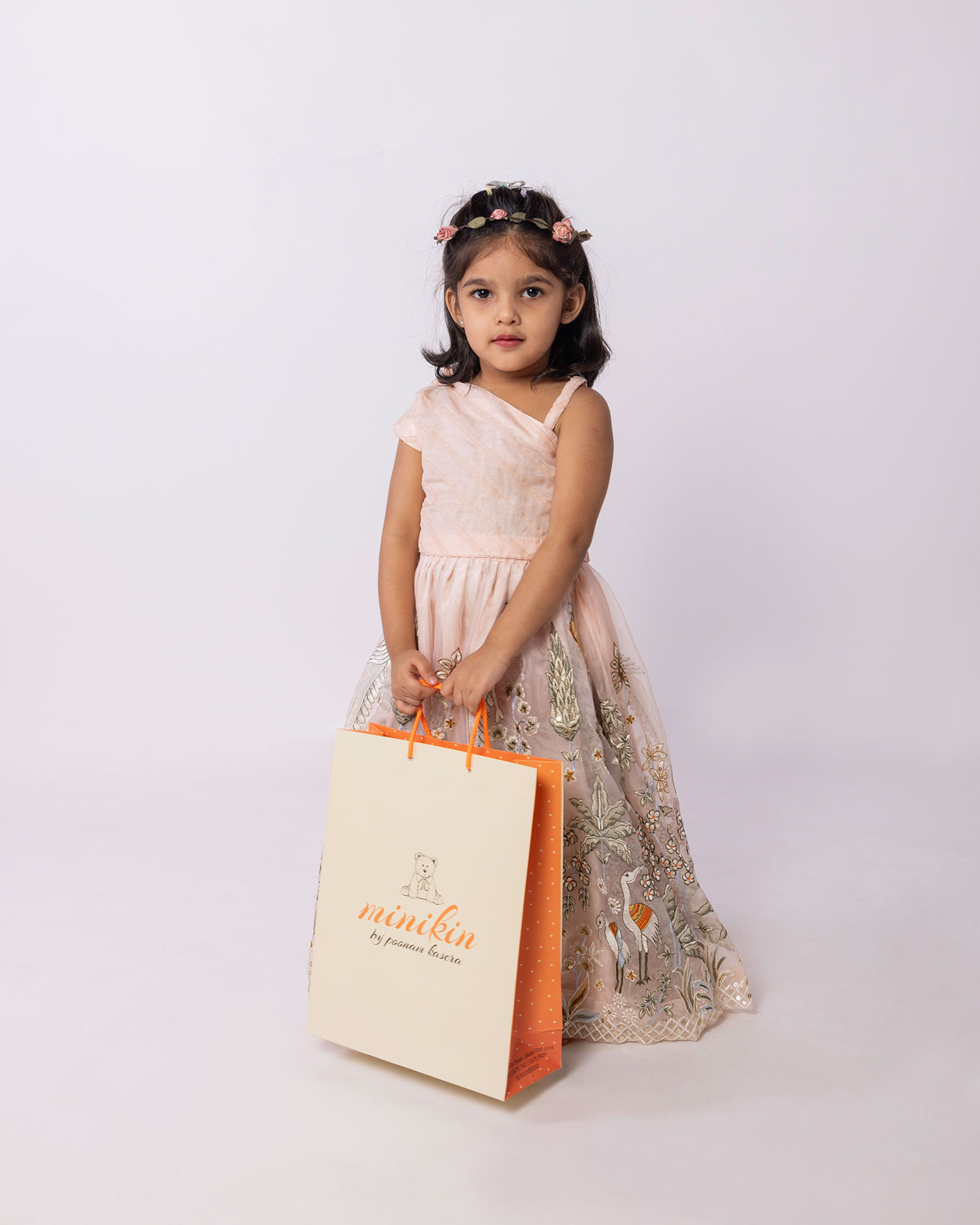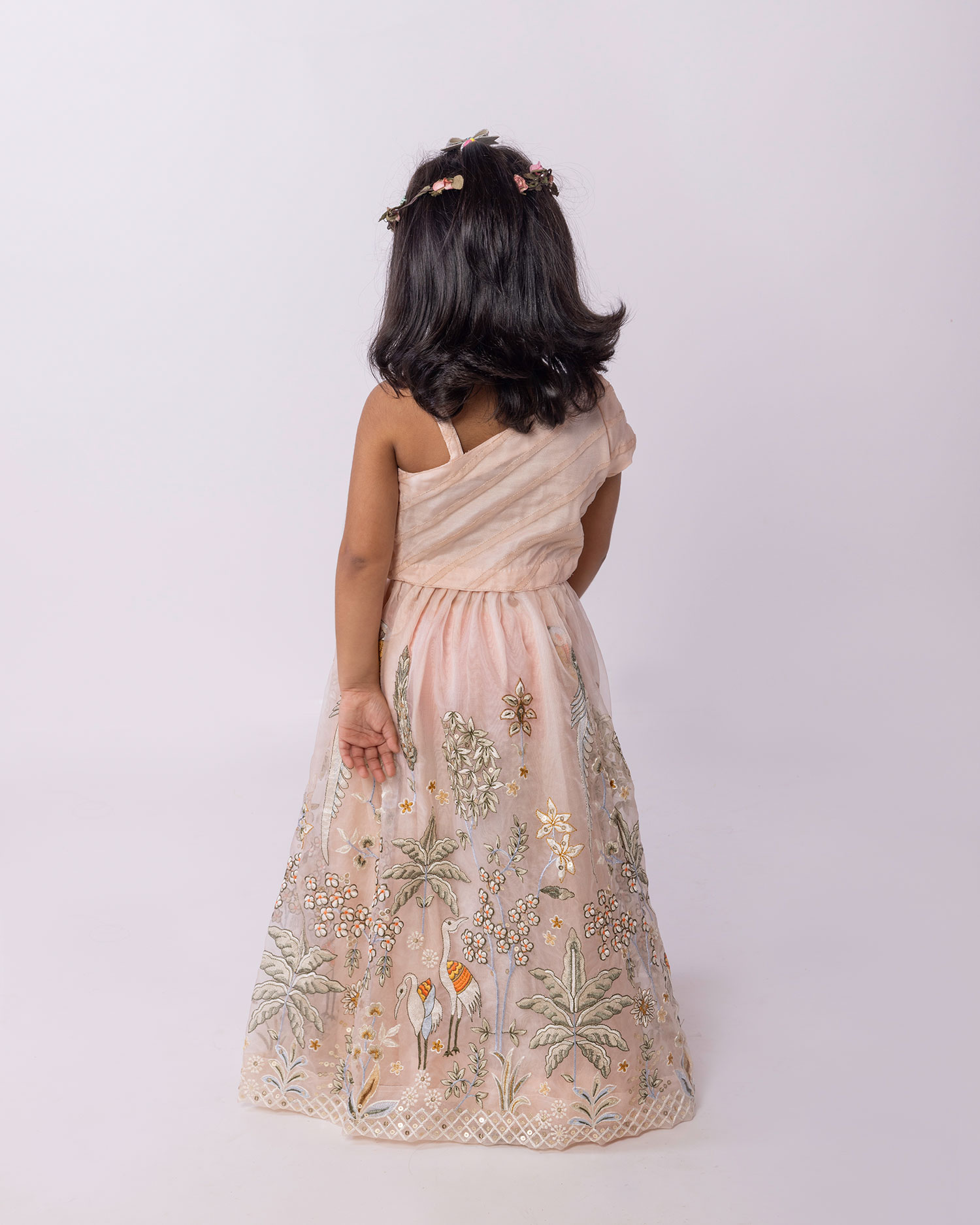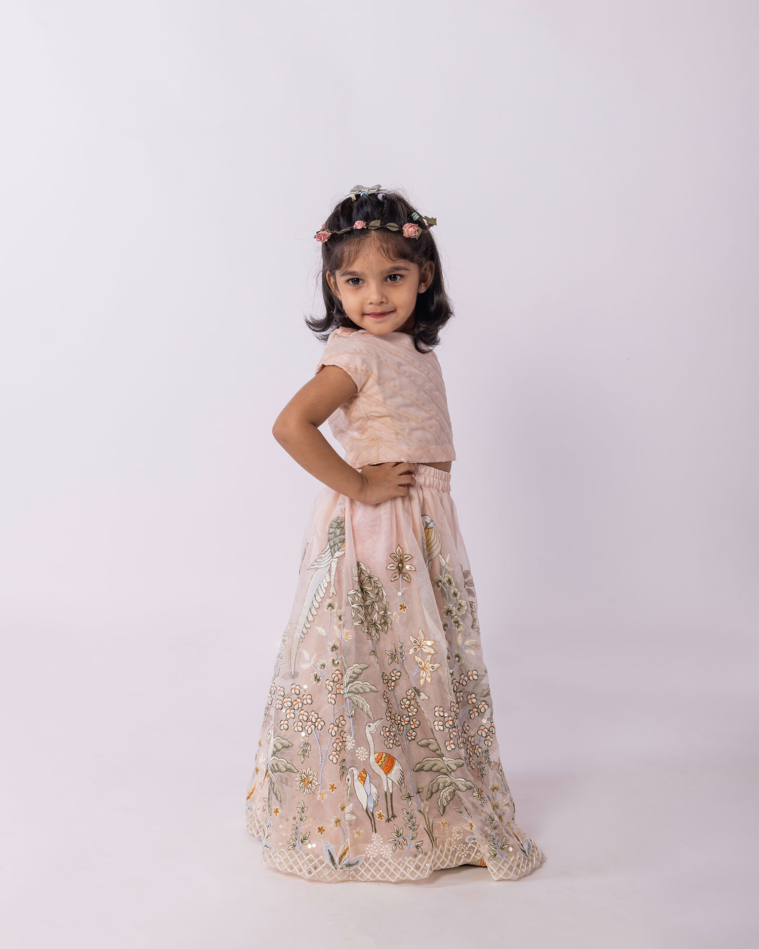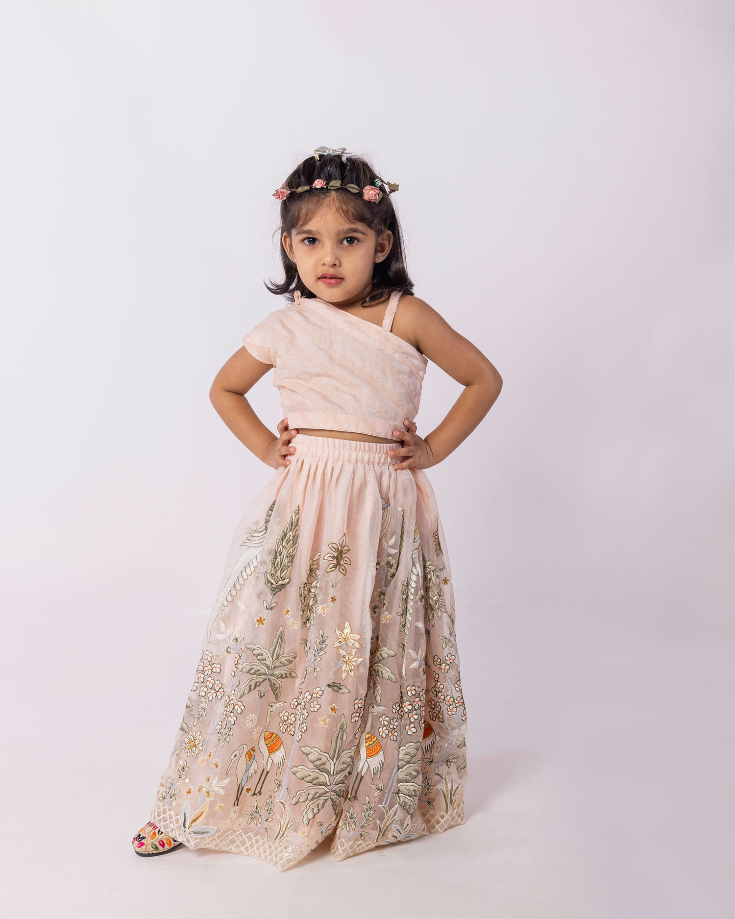 Peach organza embroidered lehenga paired with organza top with pleats in silver thread.