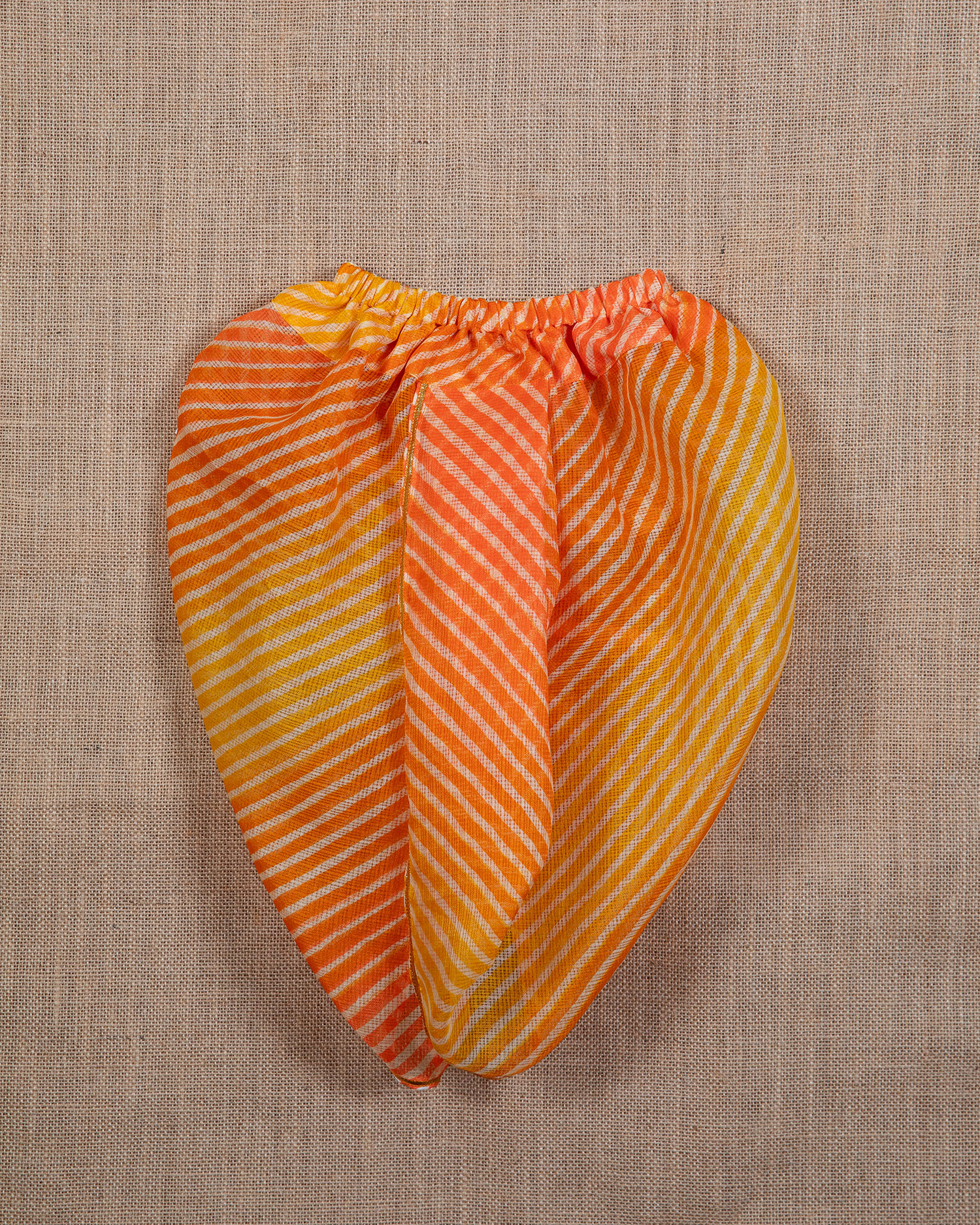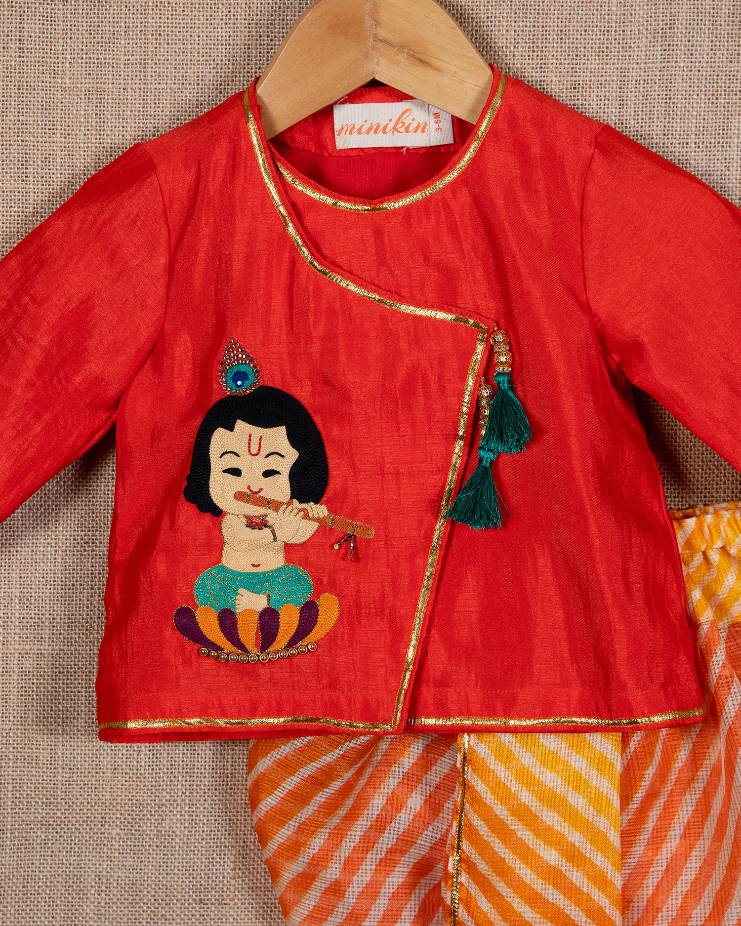 Red cotton silk angarkha embellished with hand embroidered krishna motif paired with leheriya dhoti