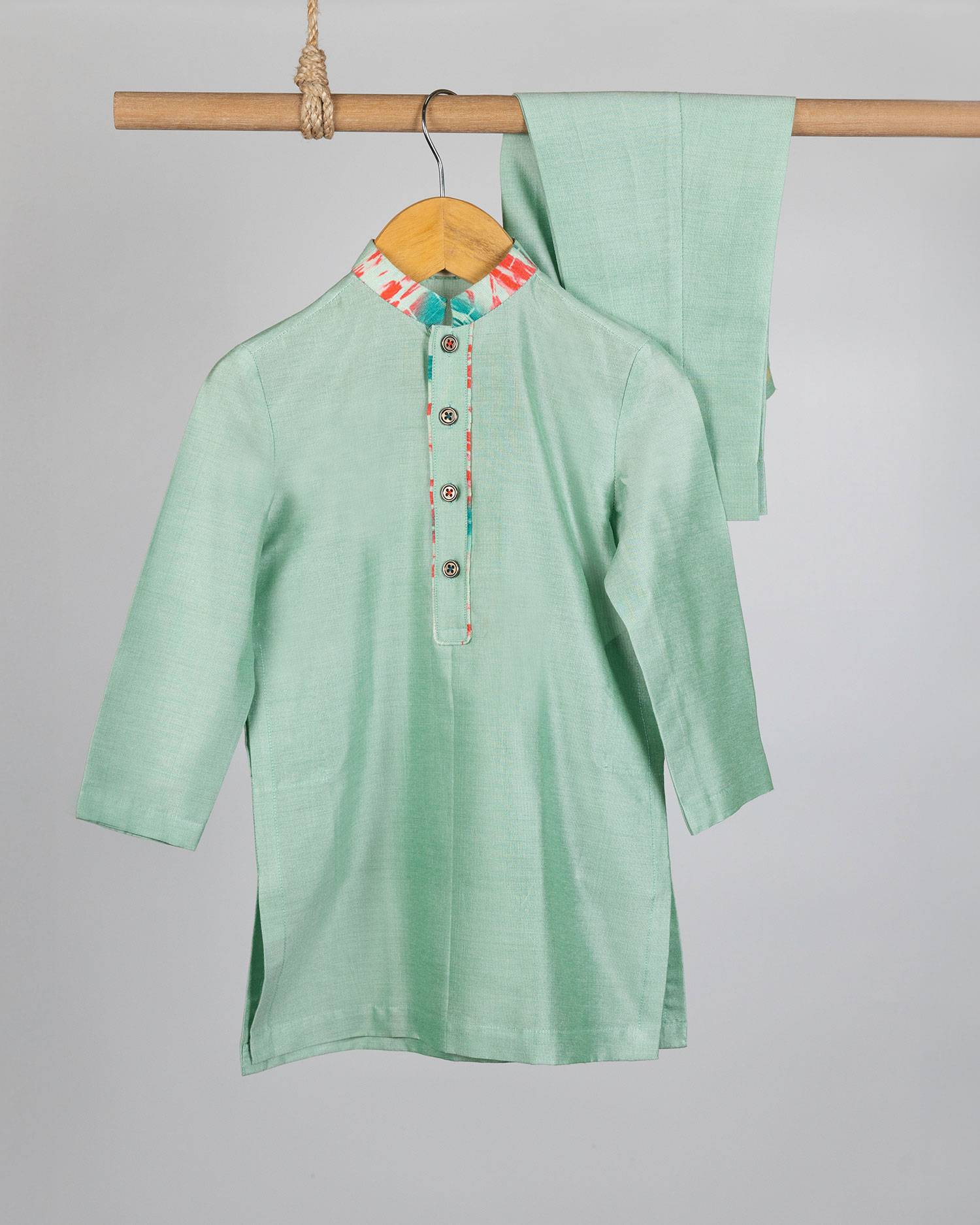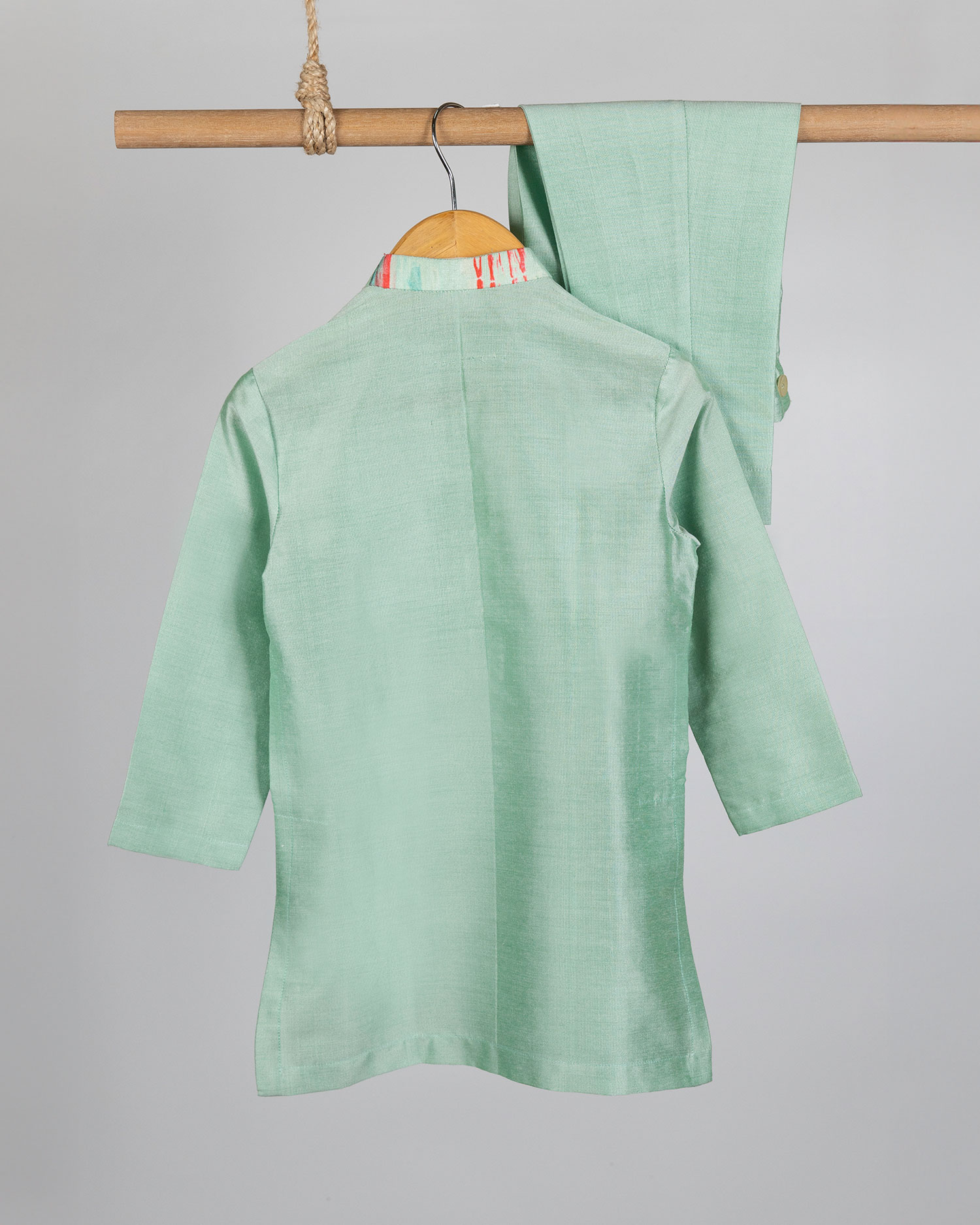 Tie and dye printed jacket paired with sea green kurta and pants.