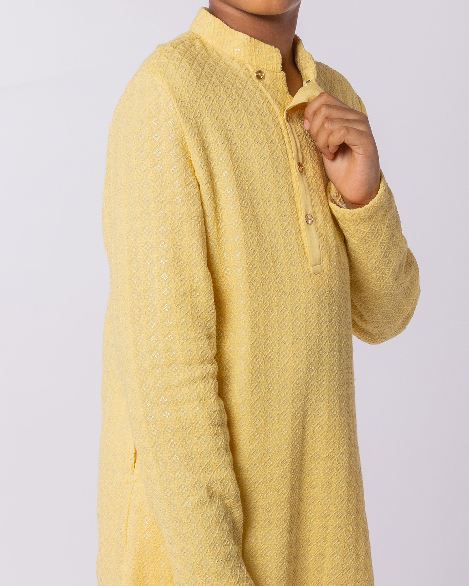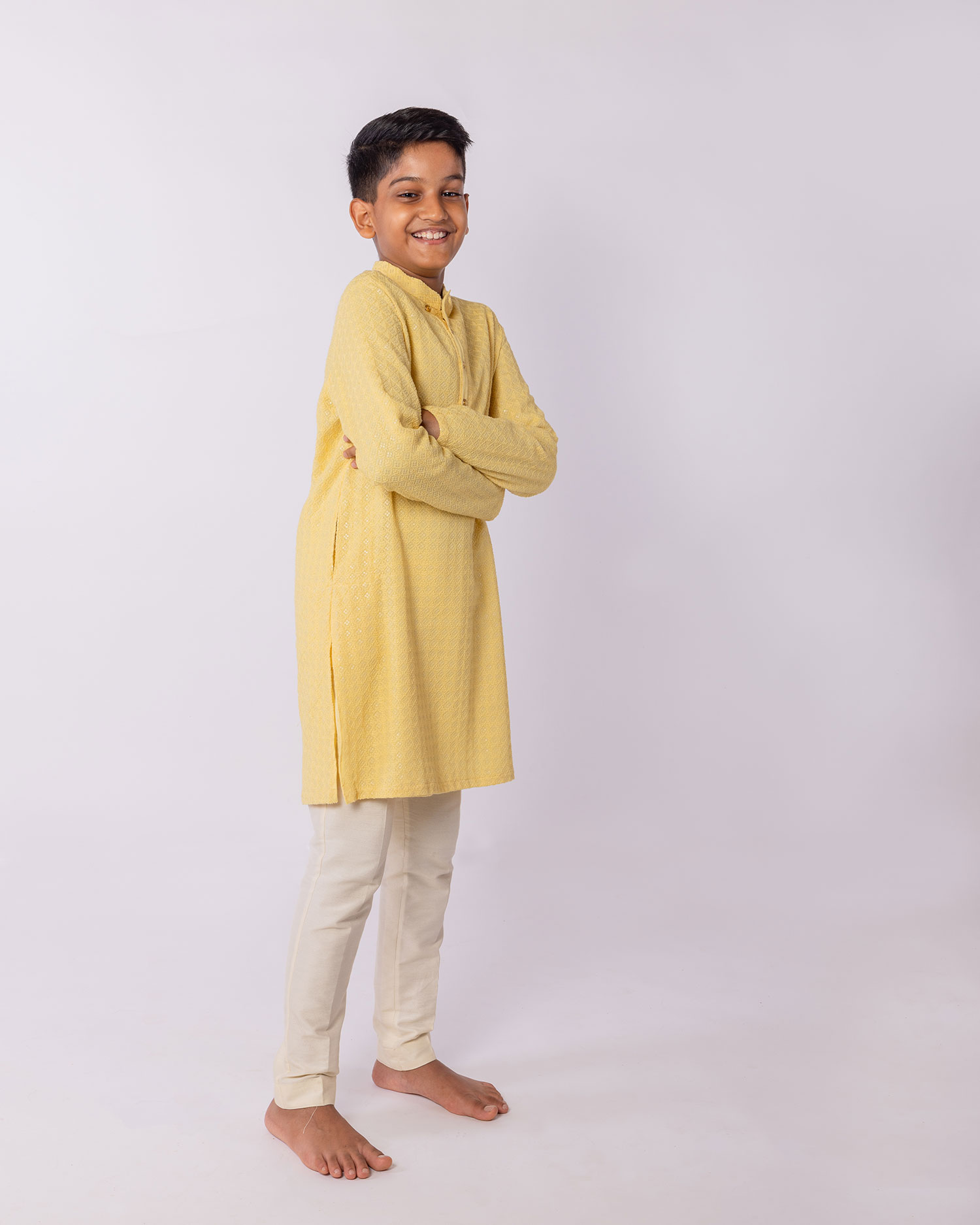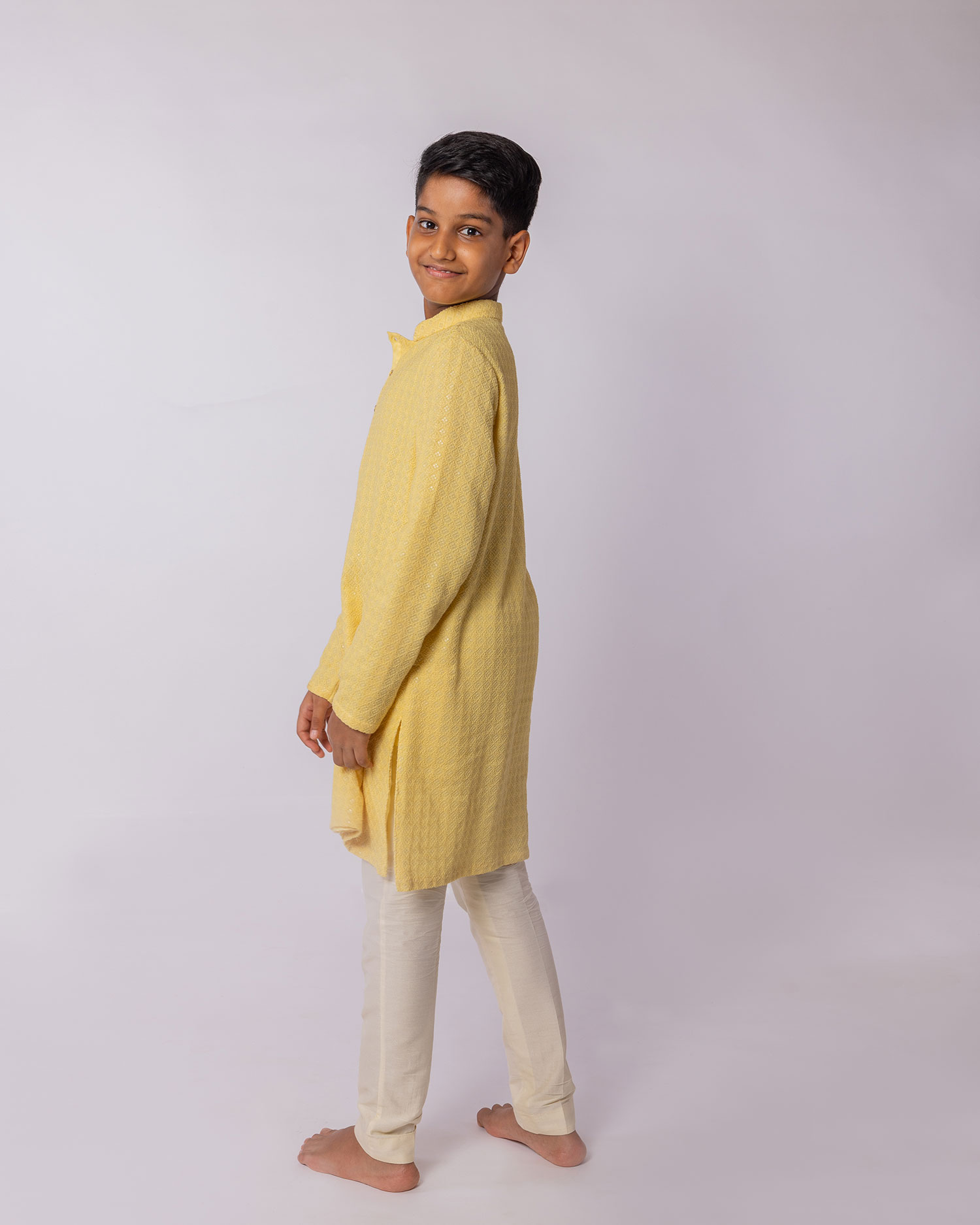 Yellow luckhnawi kurta with cotton lining paired with pants.