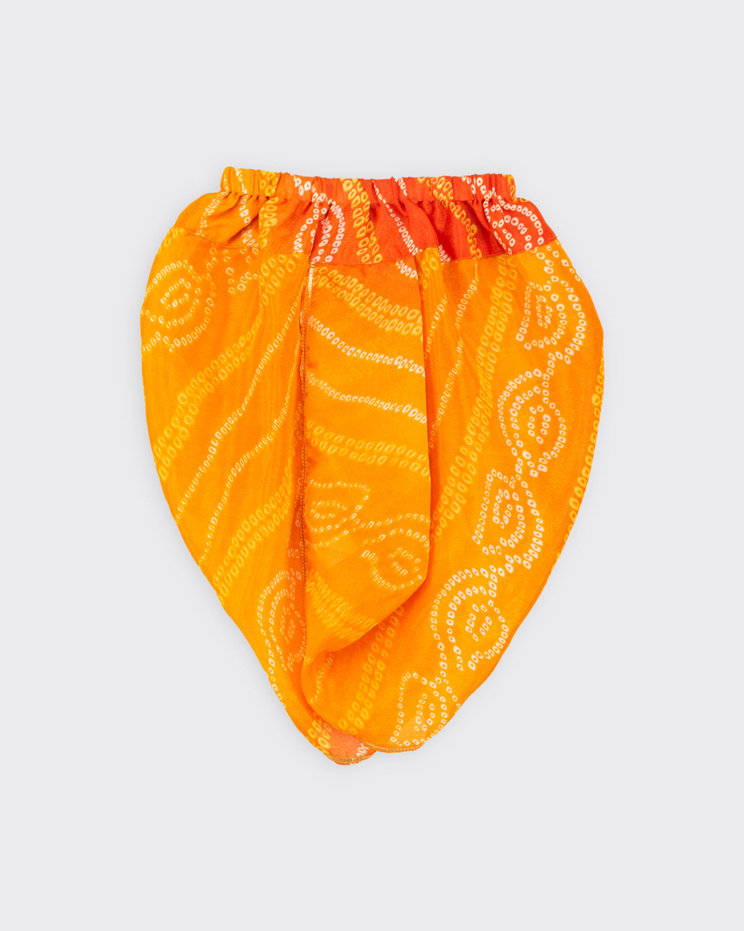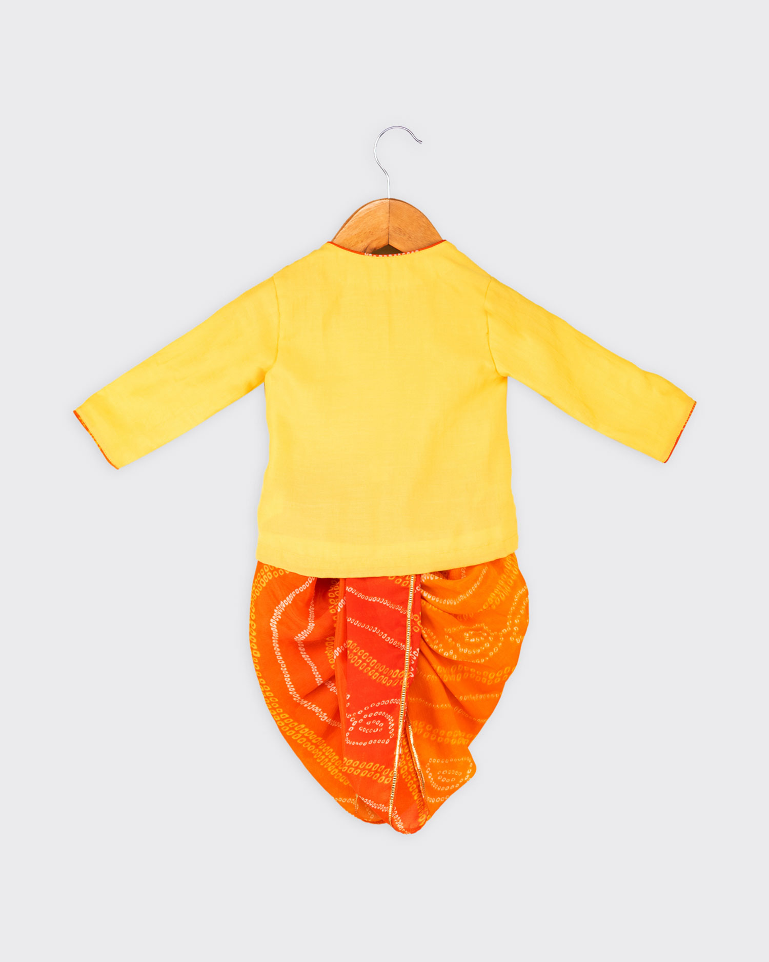 Yellow muslin angarkha with hand embroidered krishna motif with bandhej pocket paired with bandhej dhoti
