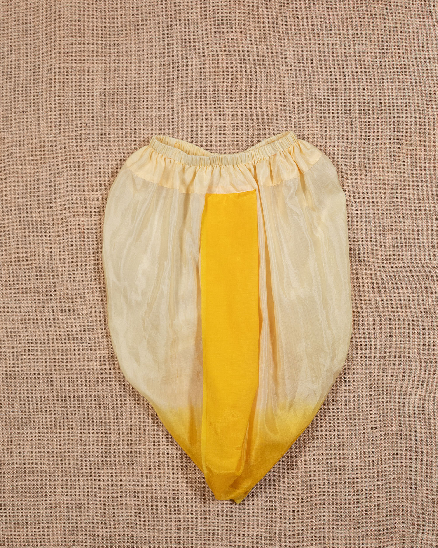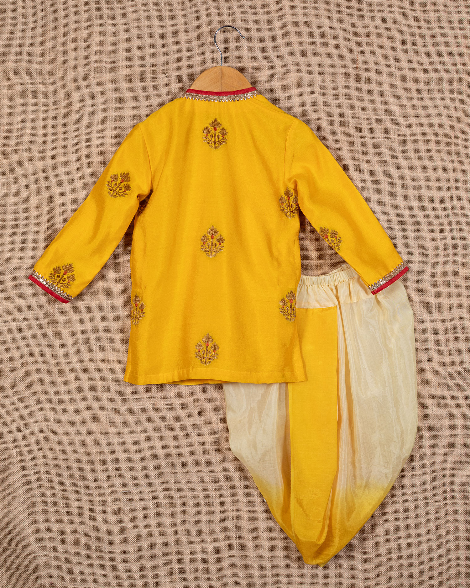 Yellow silk angarkha with woven zari bootis paired with shaded dhoti